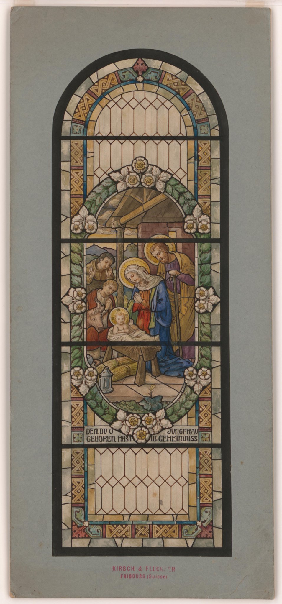Cette maquette en couleur est un projet figurant une Adoration des bergers pour la nouvelle église Sankt Stephan au Jaun. Cette version n’a pas été retenue. En effet, cette scène a été adaptée dans l’église sur une fenêtre à deux lancettes et a fait l’objet de deux cartons, les KF_264 et KF_265. Néanmoins le dessin de la maquette a été repris en grande partie dans les deux cartons.