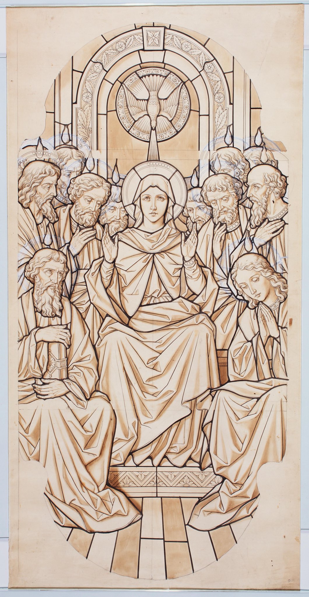 Ce carton en noir et blanc est le modèle précis à l’échelle 1:1 de la partie figurée du vitrail consacré à la Pentecôte pour la quatrième fenêtre à gauche dans la nef de la nouvelle église Sankt Stephan au Jaun.