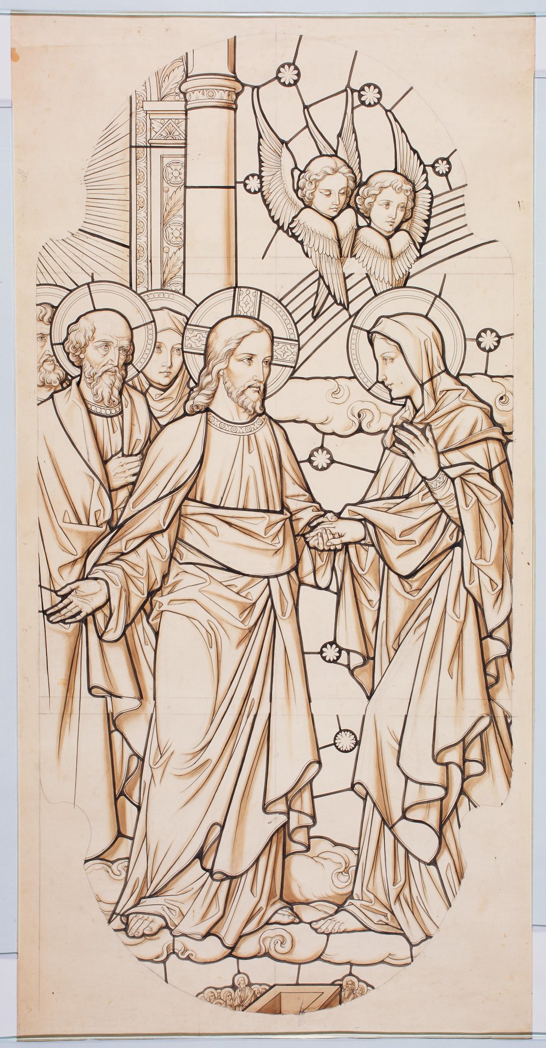 Ce carton en noir et blanc est le modèle précis à l’échelle 1:1 de la partie figurée du vitrail consacré à l’Accueil de la Vierge au ciel par Jésus pour la troisième fenêtre à gauche dans la nef de la nouvelle église Sankt Stephan au Jaun.