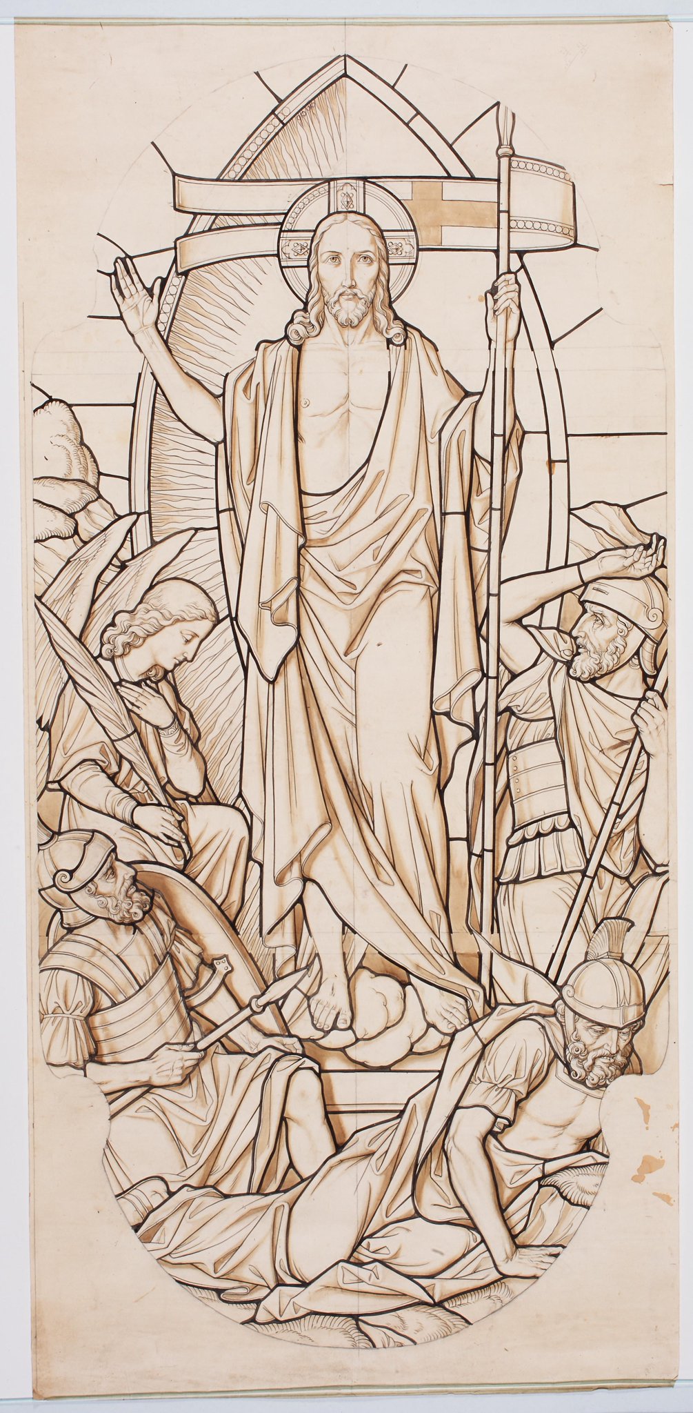 Ce carton en noir et blanc est le modèle précis à l’échelle 1:1 de la partie figurée du vitrail consacré à la Résurrection pour la sixième fenêtre à gauche dans la nef de la nouvelle église Sankt Stephan au Jaun.