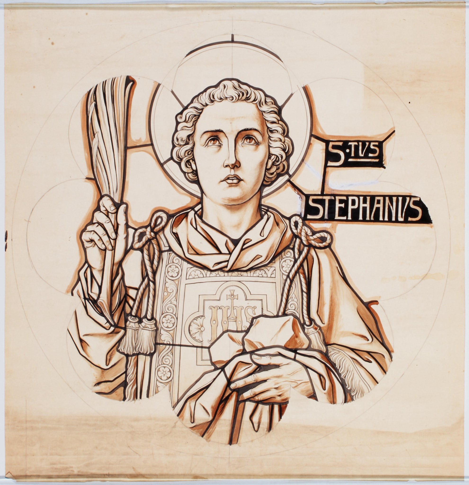 Ce carton en noir et blanc est le modèle précis à l’échelle 1:1 de la partie figurée du vitrail consacré à saint Etienne pour la fenêtre axiale dans le choeur de la nouvelle église Sankt Stephan au Jaun. Toute la partie décorative manque mais la forme de l’ouverture est indiquée avec précision. Sous la scène on trouve cette inscription : “Gestiftet von J. Desfossez, Pfr ·”.