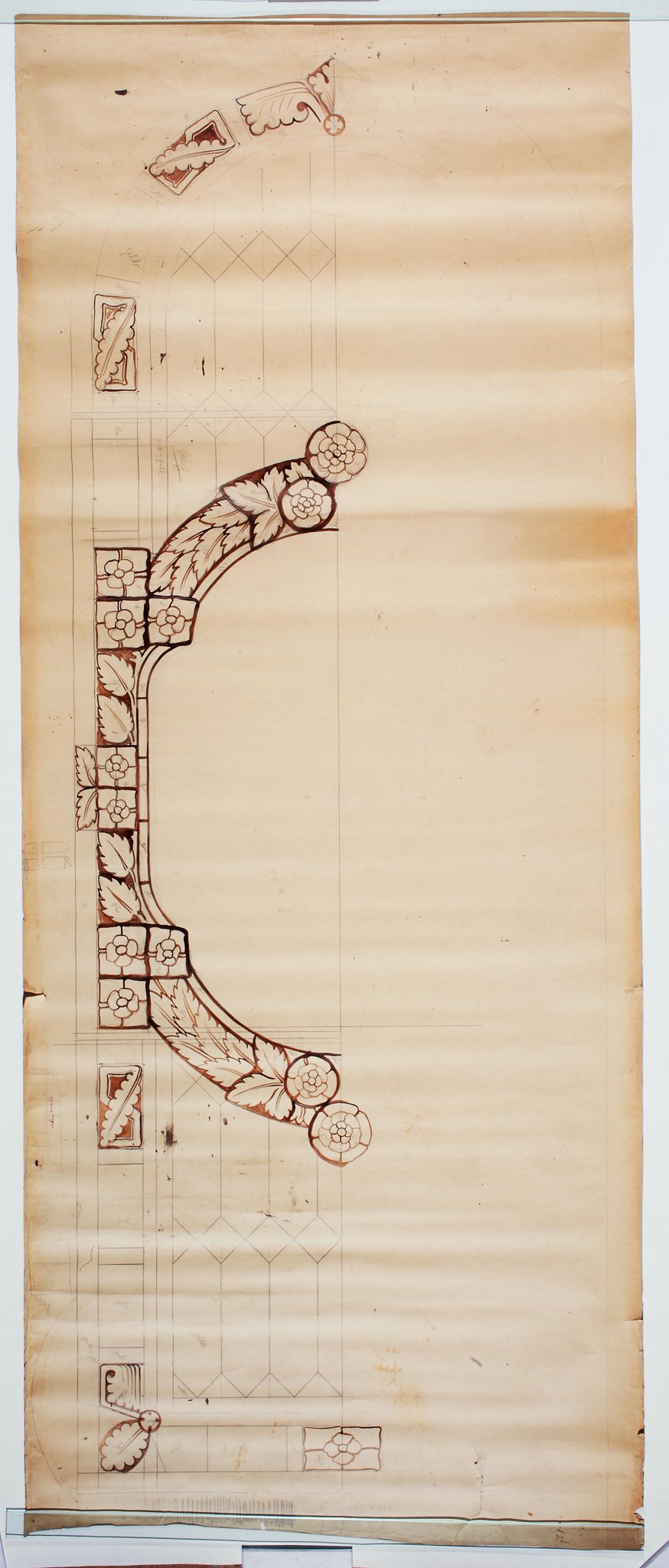 Carton pour l'encadrement ornemental d'un vitrail, partiellement dessiné. Au centre figure la moitié d'une bordure végétale agrémentée de fleurs stylisées. Le fond est composé de motifs de bornes et une bordure ornementale à motifs végétaux stylisés encadre le tout, dont seules quelques portions sont représentées.