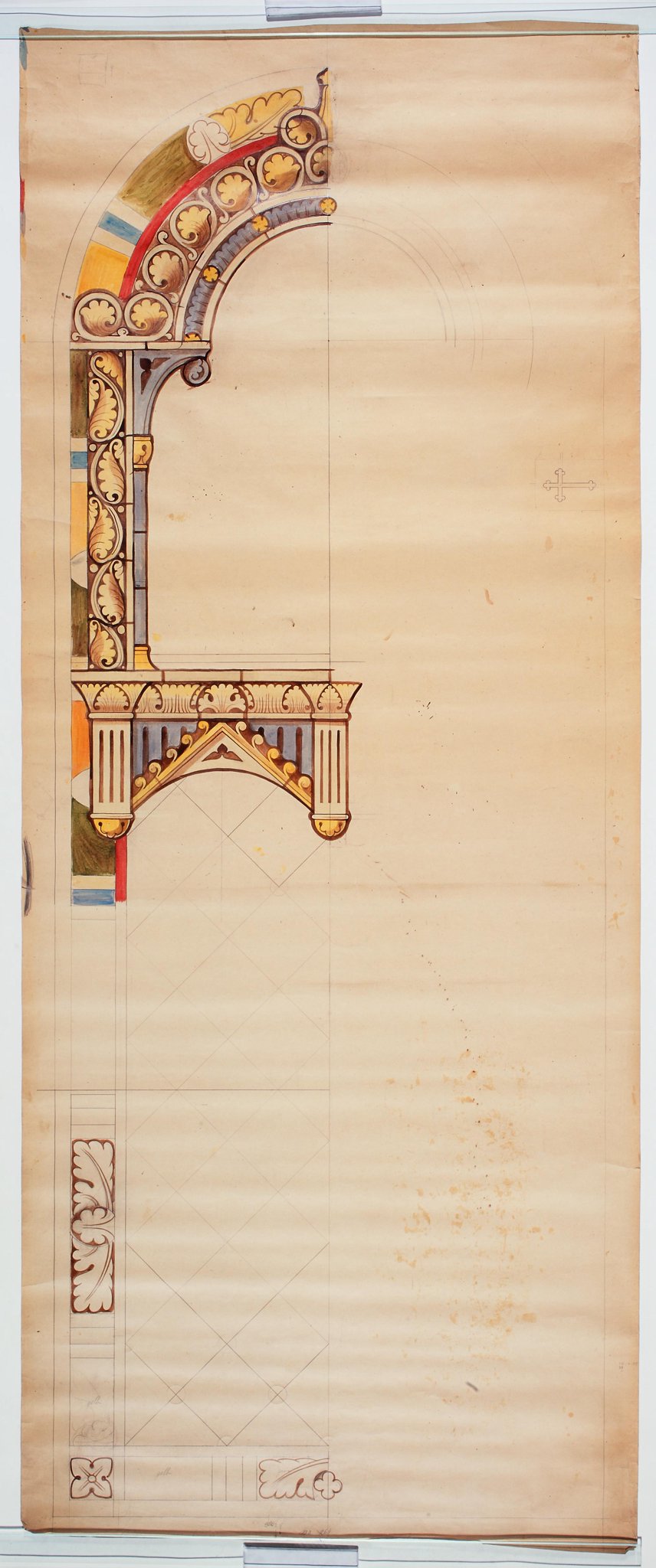 Carton pour les parties ornementales d'un vitrail dont seules quelques portions sont dessinées. En haut à gauche, un dais architectural soutient une bordure végétale de feuilles d'acanthes formant des rinceaux dorés. La partie inférieure est également surmontée d'un dais architectural avec un pignon ajouré. Une grande bordure végétale colorée encadre le tout, seulement esquissée.