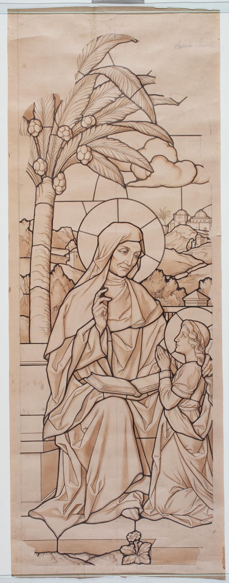 Sainte Anne, assise, tient un livre ouvert sur ses genoux, sa main gauche posée sur les épaules de la Vierge Marie. Sa main droite levée, elle porte son regard vers sa fille agenouillée et en prière devant elle. Elle lui enseigne la lecture des saintes Ecritures à l’ombre d’un palmier, avec des maisons en arrière-plan.