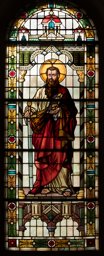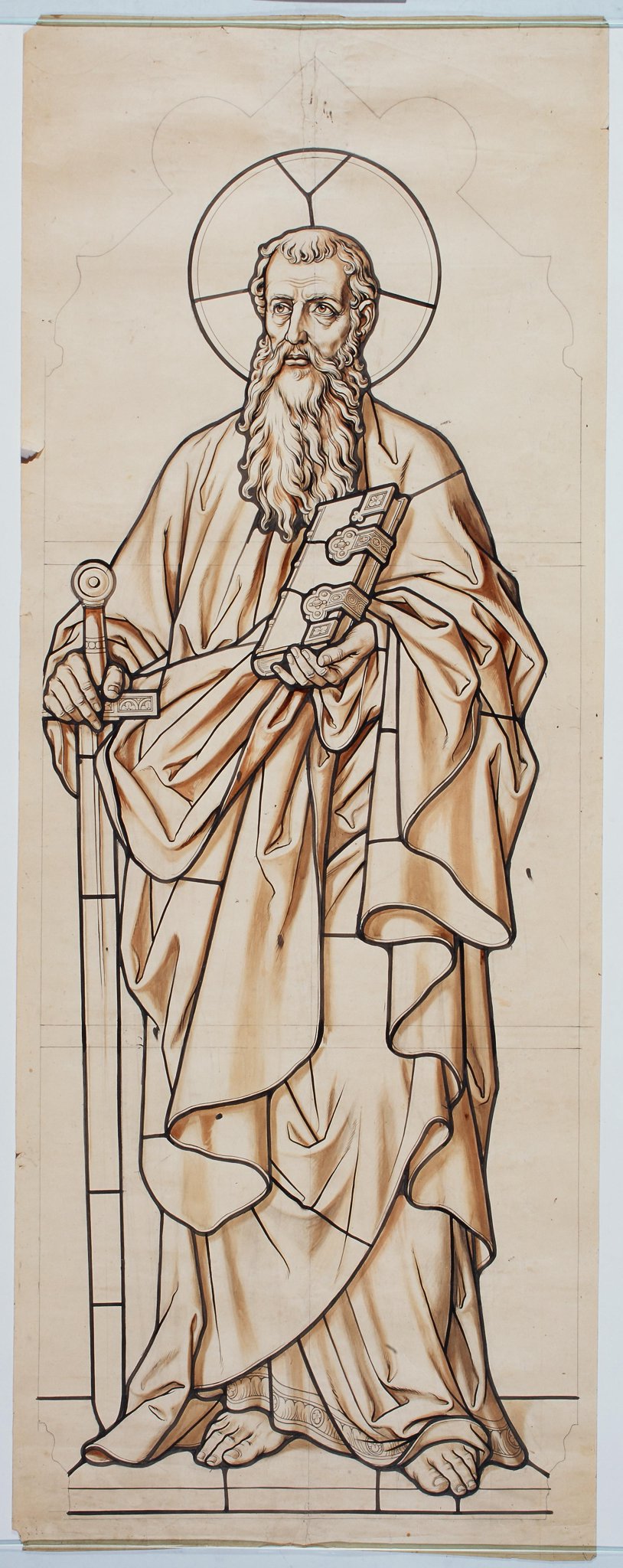Toute la partie décorative manque mais la forme de l’ouverture est indiquée avec précision. Ce carton et celui consacré à saint Pierre ont été réutilisés de manière littérale pour les vitraux dédiés aux mêmes saints à l’église Saint-André d’Onnens datant de 1911-1913. Les saints y sont identiques en dehors des dais sous lesquels ils figurent et des arrière-plans.