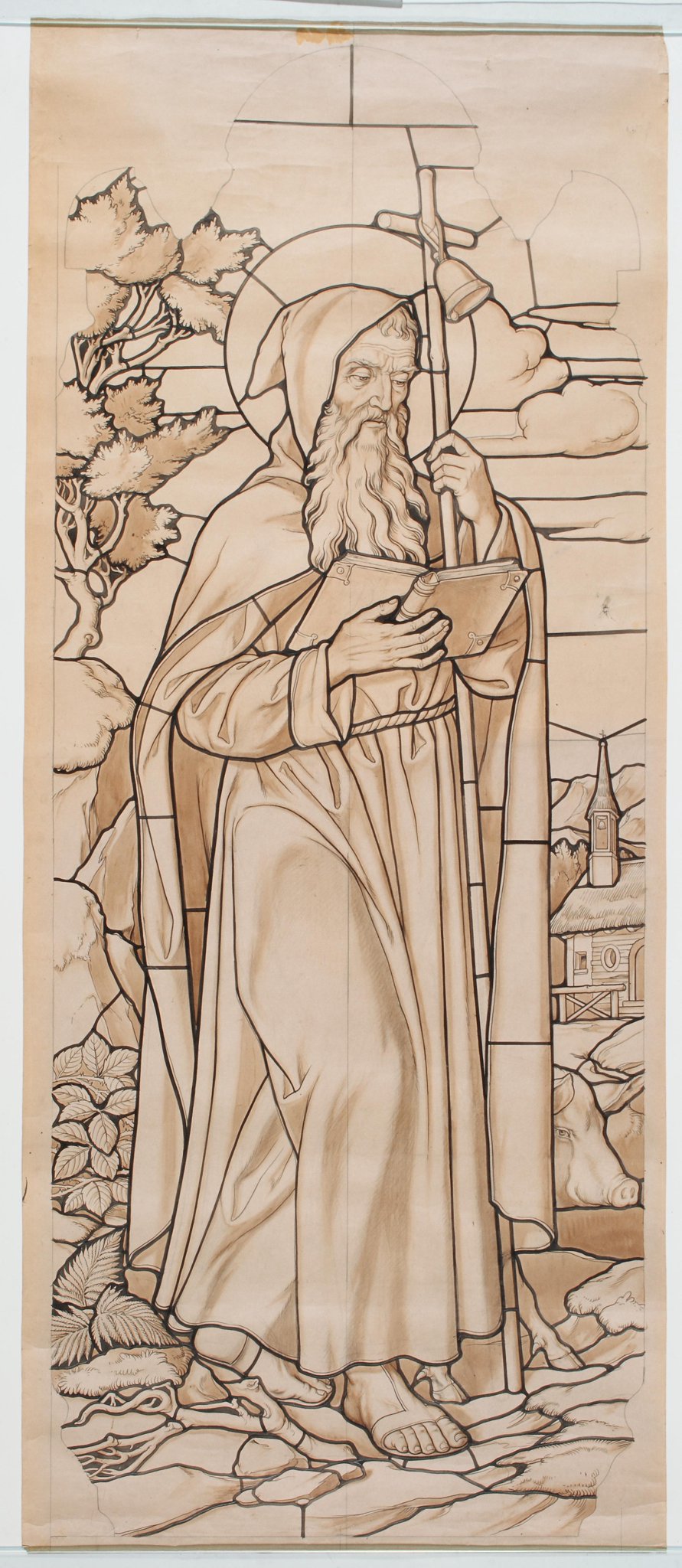 Ce carton, en noir et blanc, est le modèle précis et à l’échelle 1:1 de la partie figurée du vitrail consacré à saint Antoine pour la cinquième fenêtre à gauche dans la nef de l’église Saint-André à Onnens. Toute la partie décorative manque mais la forme trilobée de l’ouverture est indiquée avec précision.