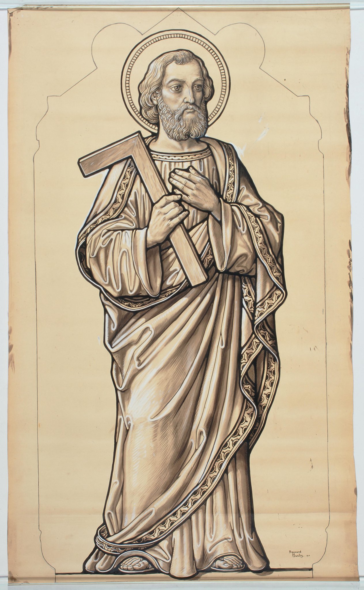 Le cycle des onze vitraux pour Villarlod date de 1910, année de construction de l’église (Lauper, 2012, p. 222; Meier et Perritaz, 1990, p. 27). Ils sont créés après le cycle de l’église Saint-Jean-Baptiste de Grolley (1907). D’un point de vue stylistique, ils s’en approchent fortement, les aspects décoratifs du vitrail prennent une place aussi importante que la représentation du saint. Quant aux personnages, l’artiste prend le parti de s’éloigner d’une représentation très réaliste pour aller vers une figuration plus stylisée allant vers l’essentiel. Les cartons pour les vitraux du transept et du choeur sont tous signés Raymond Buchs. Quatre cartons présentent les différentes parties ornementales des vitraux de la nef, du transept et du choeur. Bien qu’ils ne soient pas signés, il est presque certain qu’ils sont de la main de l’artiste comme le style du graphisme le laisse supposer.