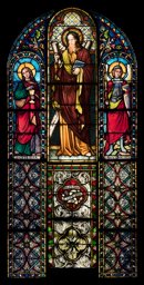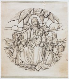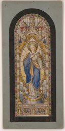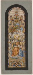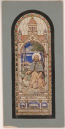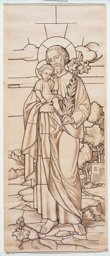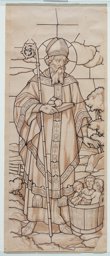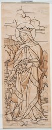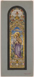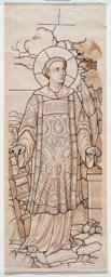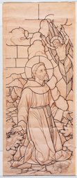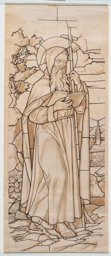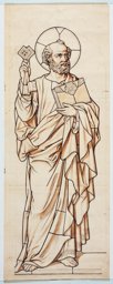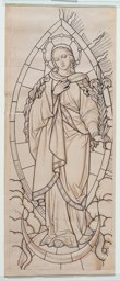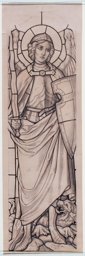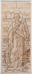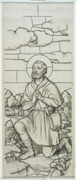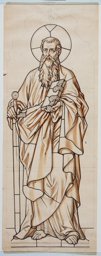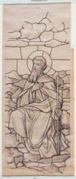Ce carton en noir et blanc illustrant Jean l’Evangéliste est le modèle précis à l’échelle 1:1 de la partie figurée droite de la fenêtre axiale consacrée à saint André à l’église Saint-André à Onnens. Toute la partie ornementale manque.