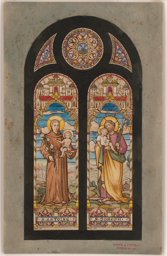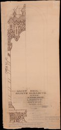 Dans le fonds Kirsch et Fleckner, il manque les deux cartons pour les vitraux de la façade occidentale consacrés à saint Jean-Baptiste et le Bienheureux curé d’Ars ainsi que les deux cartons dédiés à saint Pierre et saint Paul pour les deux vitraux entourant la fenêtre axiale du choeur. Ces deux saints sont une reprise littérale des cartons KF_262 et KF_400 consacrés aux mêmes saints pour les deux vitraux du choeur de l’église Sankt Stephan au Jaun. Il semblerait que l’atelier Kirsch et Fleckner ait réutilisé ces cartons pour Onnens tout en inscrivant les deux saints sous des dais et devant des fonds différents qui font l’objet de deux cartons (KF_1173 et KF_1174).