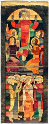 Sur la partie supérieure, le Christ debout au premier plan tient sa croix de son bras gauche alors que de l’autre il touche sa mère debout devant lui, sa tête penchée vers lui. Tous deux ferment les yeux. Derrière eux deux soldats soutiennent la croix ; celui de droite porte un fouet. A l’arrière-plan un cavalier sur sa monture de profil marche vers l’avant.