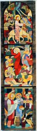 Sur la partie inférieure, le Christ crucifié penche sa tête vers sa mère debout devant lui, se cachant le visage avec sa main gauche. Agenouillée au pied de la croix, Marie-Madeleine lève ses bras vers les jambes du Christ. A droite, Jean regarde le Christ les bras ballants. A l’arrière plan, une foule regarde la scène.