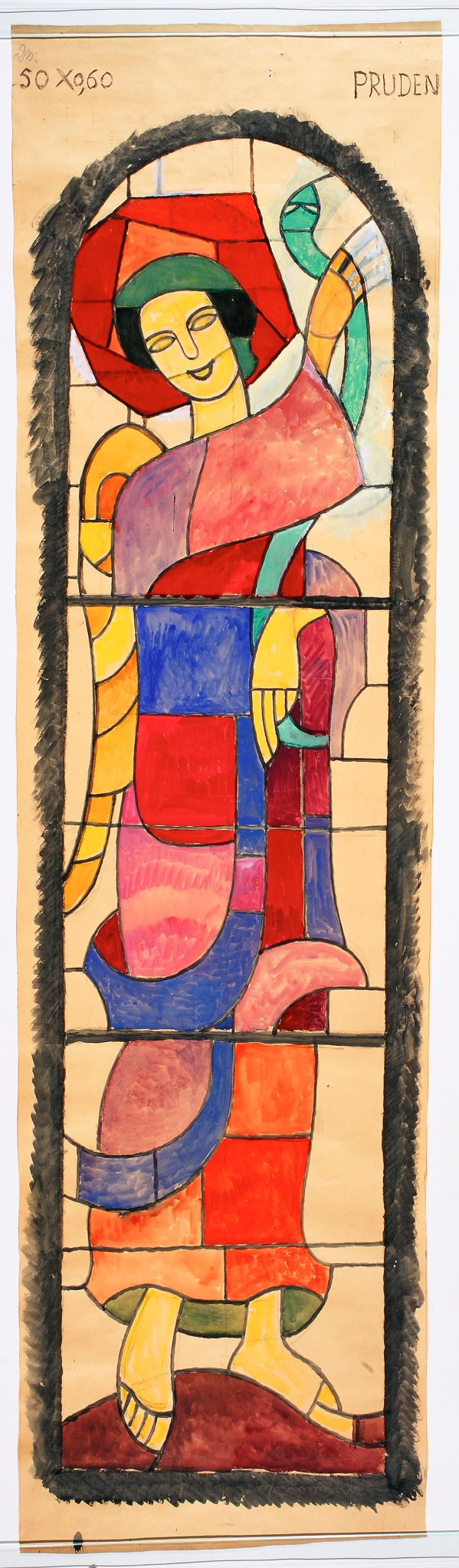 Ce carton en couleur est le modèle à l’échelle 1:1 d’un vitrail consacré à la Prudence qui pourrait avoir été imaginé pour l’une des fenêtres hautes de la nef de l’église Sainte-Thérèse dans le quartier de Champel à Genève selon les indications écrites sur un bout de carton déchiré (aujourd’hui disparu mais mentionné dans l’inventaire par Augustin Pasquier) accompagnant un rouleau de cartons pour Sainte-Thérèse. Les dimensions mentionnées sur ce carton semblent concorder avec la taille de l’ouverture des fenêtres hautes de la nef. En date du 3 janvier 1949, Castella envoie au curé Carlier de la paroisse Sainte-Thérèse de Genève quelques cartons pour ces hauts-jours (voir inscription au verso du KF_1028). Nous ne connaissons pas les raisons pour lesquelles ce projet n’a pas abouti mais une des plus probables est que Castella quitte la Suisse pour retourner en Australie au cours de cette année 1949. Finalement ces hauts-jours n’ont pas été parés de vitraux.