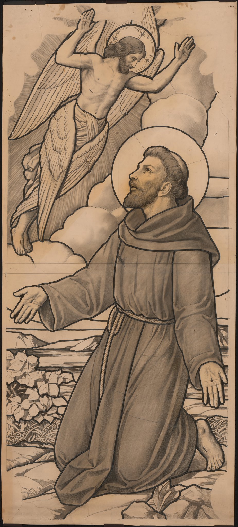 Ce carton en noir et blanc est le modèle précis à l’échelle 1:1 de la partie figurée du vitrail consacré à saint François d’Assise pour la troisième fenêtre à droite dans la nef de l’église Notre-Dame-de-l’Immaculée-Conception à Neyruz. Toute la partie ornementale manque.