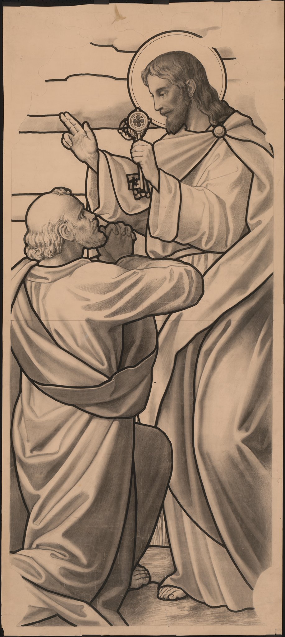 Ce carton en noir et blanc est le modèle précis à l’échelle 1:1 de la partie figurée du vitrail consacré à la remise des clefs à saint Pierre pour la première fenêtre à droite dans la nef de l’église Notre-Dame-de-l’Immaculée-Conception à Neyruz. Toute la partie ornementale manque.