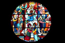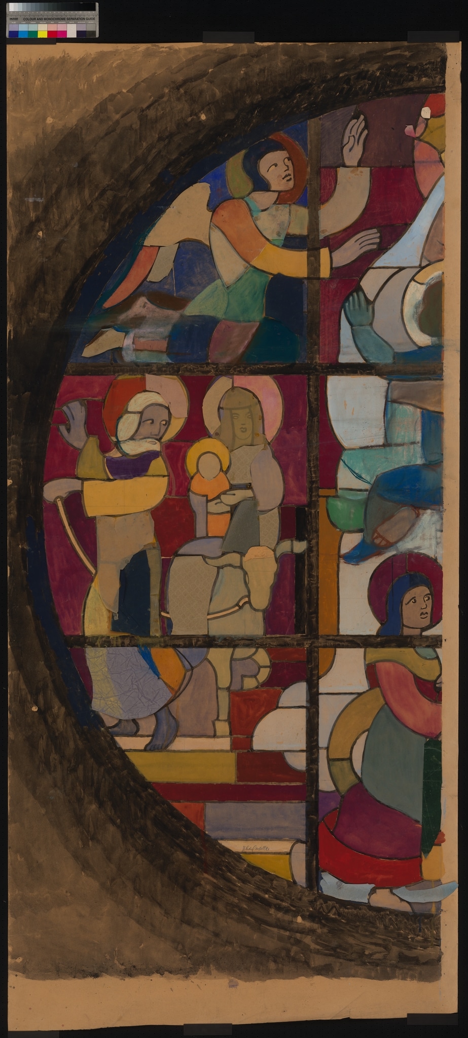 Ce carton représente la partie gauche de la rose dédiée à la Vierge à l'Enfant. Seuls y figurent à droite une partie de la couronne de la Vierge, les bras et jambes gauches du Christ et en bas sainte Ann.
