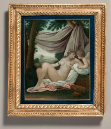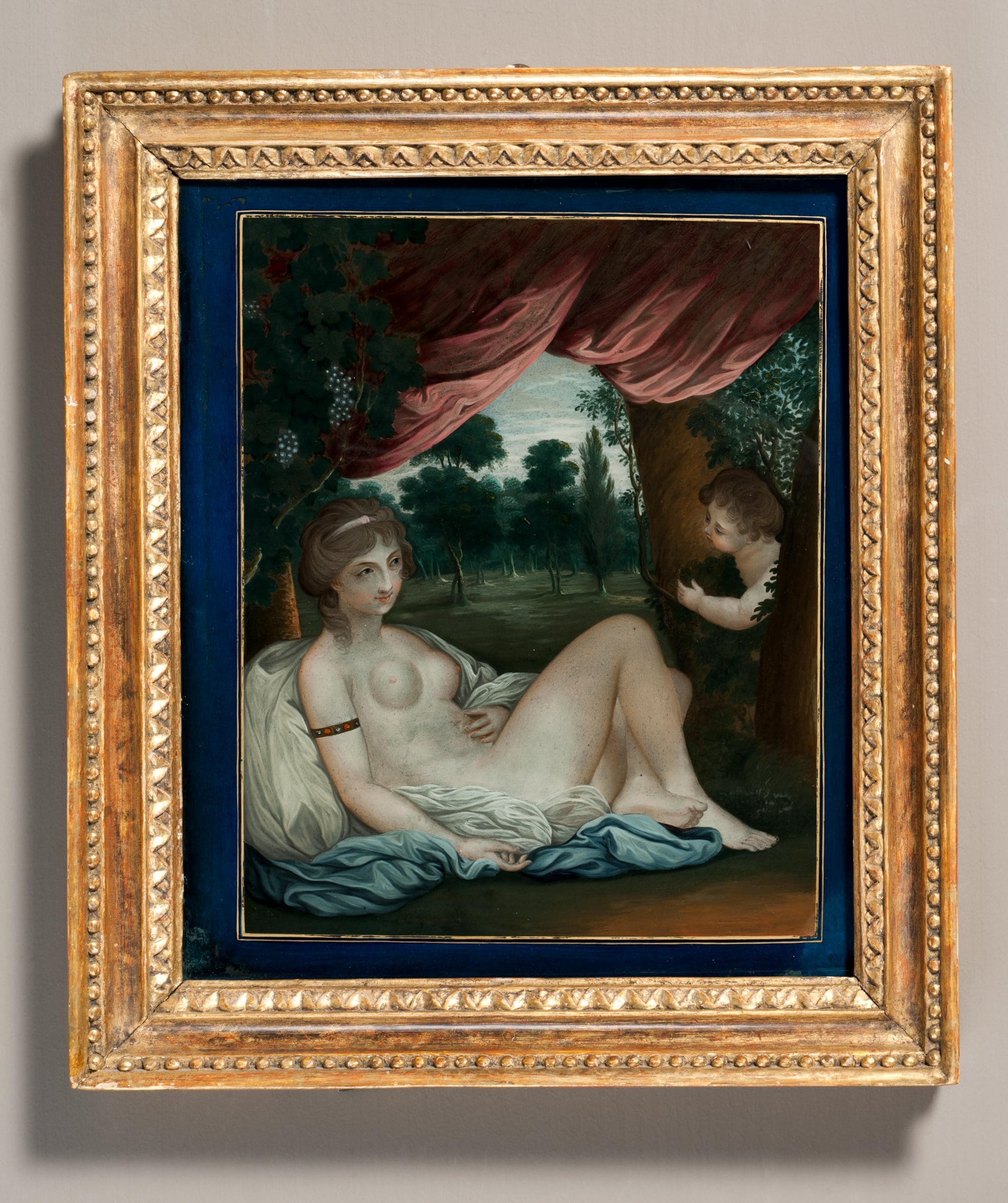 Venus und Amor sind nach einer bisher unbekannten europäischen Stichvorlage vor einer Waldlichtung dargestellt. Unter Reben liegt links Venus halbaufgerichtet nackt auf weissen und hellblauen Stoffbahnen. Ihr hellbraunes Haar mit Ringellocke umschliesst ein Band, an ihrem rechten Oberarm trägt sie ein Schmuckband. Unter roten Draperien, die von den Bäumen herunterhängen, nähert sich von rechts zwischen den Baumstämmen hervorkommend das braungelockte Amorkind.
