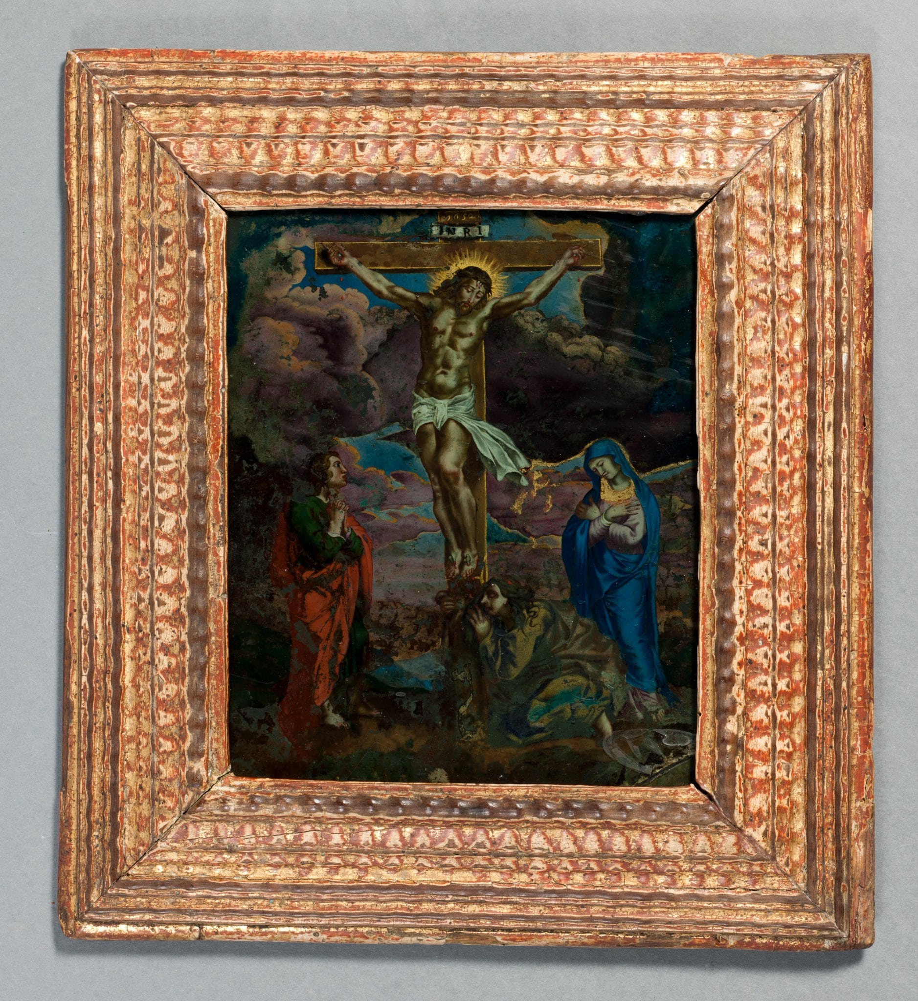 Ob die handschriftlich angebrachten Namenszüge (Gilbert? und Philbert de D?) hinten auf der alten Abdeckplatte des nicht originalen Rahmens einen Hinweis auf den Entstehungsort geben können, kann zur Zeit nicht beantwortet werden. Das Hinterglasgemälde dürfte eine seitenverkehrte Übernahme einer graphischen Vorlage sein, da Maria zur linken und nicht wie üblich zur rechten Seite Christi steht.