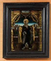 Alte, nicht originale Papierunterlage. Alter, möglicherweise nicht originaler, profilierter schwarzer Weichholzrahmen.