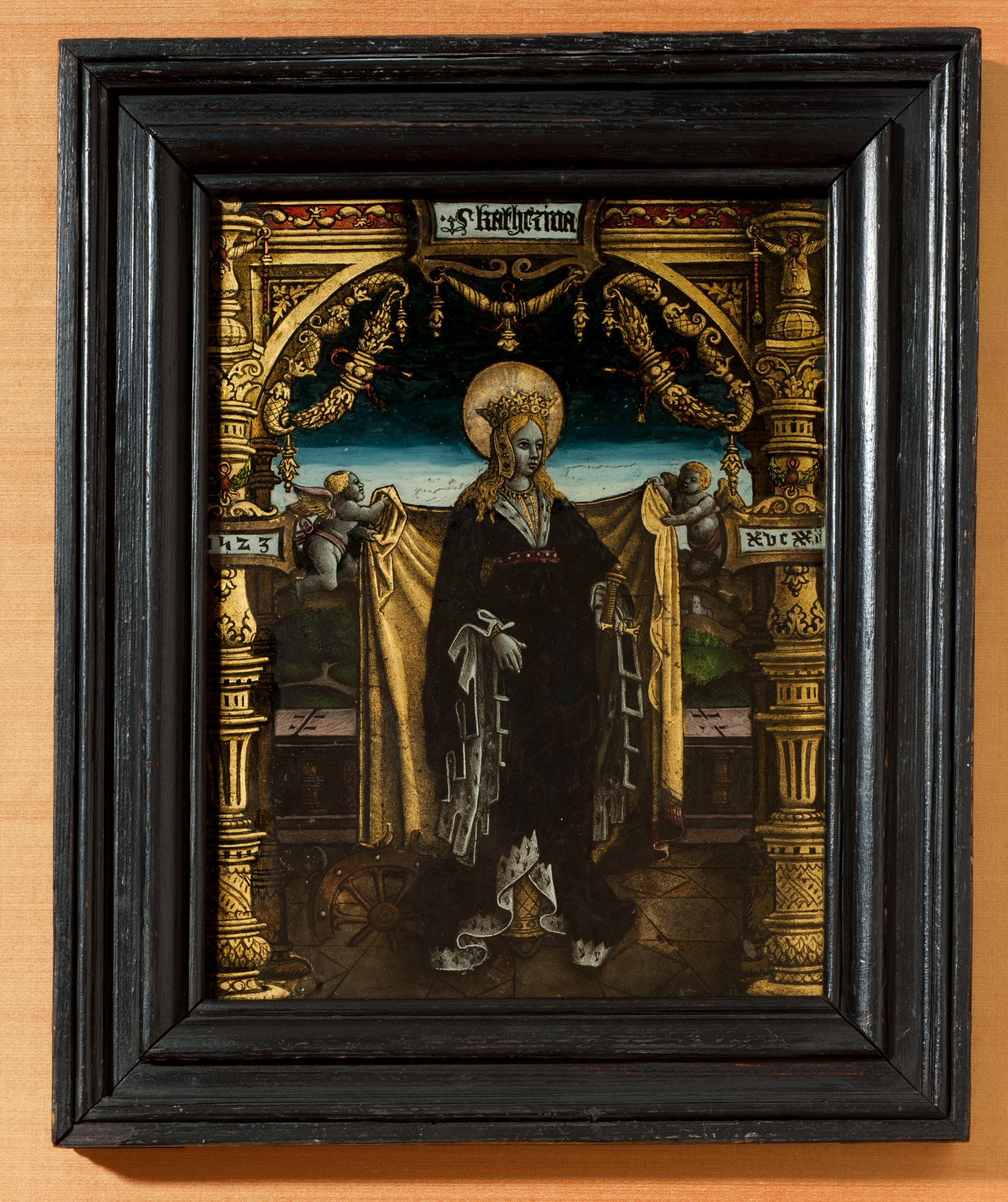 Unter einer Renaissance-Bogenstellung mit Blattgirlanden und ornamentierten Säulen steht auf braunem Fliesenboden vor einer Balustrade die hl. Katharina neben dem zerbrochenen Folterrad. Sie trägt als Königstochter die modische niederländisch-burgundische Tracht mit einem hochgegürteten, hermelinverbrämten Mantel und auf dem langwallenden Blondhaar die Krone; als Märtyrerin hält sie das Richtschwert. Zwei Engelchen spannen als Zeichen der Erhöhung hinter ihr ein Tuch empor, das einen Teil der hügeligen, bewaldeten und burgbesetzten Landschaft verbirgt. Auf dem Gebälkfries findet sich die Inschriftkartusche mit der Bezeichnung S katherina, auf den Säulen sind Rähmchen mit der Jahreszahl 1523 angebracht, links in arabischer, rechts in römischer Schrift XVCXXIII.