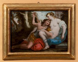 Vor bewaldeter Landschaft mit Felsen und einem Haus im Hintergrund sinkt der schöne Jüngling Adonis sterbend auf das linke Knie. Die rechte Hand auf einen Stein stützend, die linke zum Himmel erhoben, wendet er den blonden Lockenkopf vor gebauschtem rotem Schultermantel rückwärts, während der grosse Eber, aus dem Gebüsch hervorbrechend, seine linke Flanke attackiert. Hinter dem Geliebten der Aphrodite ist das Hifthorn zu sehen. (Ovid, Metamorphosen 10, 503–739).