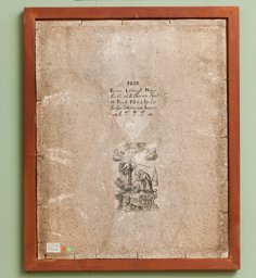 Originalrahmen. Als Unterlage einseitig geschwärztes Makulatur-Papier, auf dem einige Farben des Bildes haften blieben, darunter ungeschwärztes Büttenpapier mit unidentifiziertem Wasserzeichen. Hinterlage aus Karton, aussen und innen mit Besitzerangabe, Inv.-Nr. und Jahr beschriftet, innen mit dem Zusatz: ora . pro . Me Pecatore.