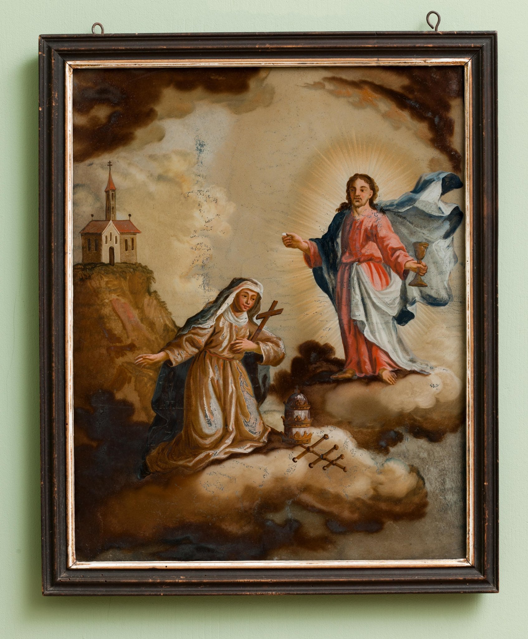 Auf dem Karton des Rückseitenschutzes – für den Betrachter des Hinterglasgemäldes also nicht sichtbar – ist ein herzförmiges Papier aufgeklebt, das beschriftet ist: N. I2 / Beron: Ioseph Kopp / Sacell: ad S: Thomam Apot / & Punct: N 4i Poss: 65. / Ecclesia Catholica cum Ioañe /=I777=. Darunter befindet sich ein kleiner Kupferstich, den M. Gastl und Johann Georg Bergmüller (1688–1762) in Augsburg mit kaiserlichem Privileg schufen. Der Hinterglasmaler hat diesen seitenverkehrt als Vorlage benutzt, dabei jedoch stark vereinfachend die äusserst komplizierten theologischen Zusammenhänge, u. a. mit den fünf Sinnen, unbeachtet gelassen. Ausserordentlich ist, dass die Vorlage auf die Rückseitenabdeckung geklebt ist und damit sozusagen der Interpretationsschlüssel zum Hinterglasgemälde gleich mitgeliefert wird. Der im Vergleich zu Arbeiten der Surseer Schule etwas sattere Farbauftrag, bei dem die Schatten gemalt sind und die Modellierung nicht allein der schwarzen Unterlage überlassen wird, vor allem aber auch die rückseitige Inschrift weisen das Hinterglasgemälde mit höchster Wahrscheinlichkeit dem Dietwiler Pfarrer Joseph Carl Kopp (1741–1805) von Beromünster zu, von dem bekannt ist, dass er sich neben seiner "gottbegnadeten" Predigertätigkeit auch der Hinterglasmalerei widmete. Zu seinen festen und besten Auftraggebern gehörte sein Jahrgänger Joseph Kopp (1741–1785), der in Beromünster Kaplan und Punktator war und die Thomas-Pfrund besetzte. Dessen gleichen inventarartigen, frommen Besitzereinträgen begegnet man nicht nur auf dem Pendant mit der Johannesvision (Kat.-Nr. 75), sondern auch auf Hinterglasgemälden in Sursee (Herz-Jesu als Guter Hirte und Maria als Gute Hirtin. Stiftung Stadtmuseum Sursee, Inv.-Nrn. ST 44 und 45. Jolidon 1995. Kat.-Nrn. 4.24 und 4.25). Das Stift St. Michael in Beromünster, seit alters ein bedeutender Hort theologischer Bildung, und die anderen Klöster und Kirchen der Innerschweiz und der Eidgenossenschaft spielten eine wichtige Rolle bei Aufträgen und in der Verbreitung von Hinterglasarbeiten. Die hintermalten profanen Kabinettstücke, die humanistisch gebildete Sammler des Manierismus philosophierend diskutierten, sind nun endgültig durch belehrende, oft moralisierende Wandzierden abgelöst worden, die in Klerikerkreisen des Barock theologisierend erläutert wurden und den Geschmack des Bürgertums wesentlich mitprägten.