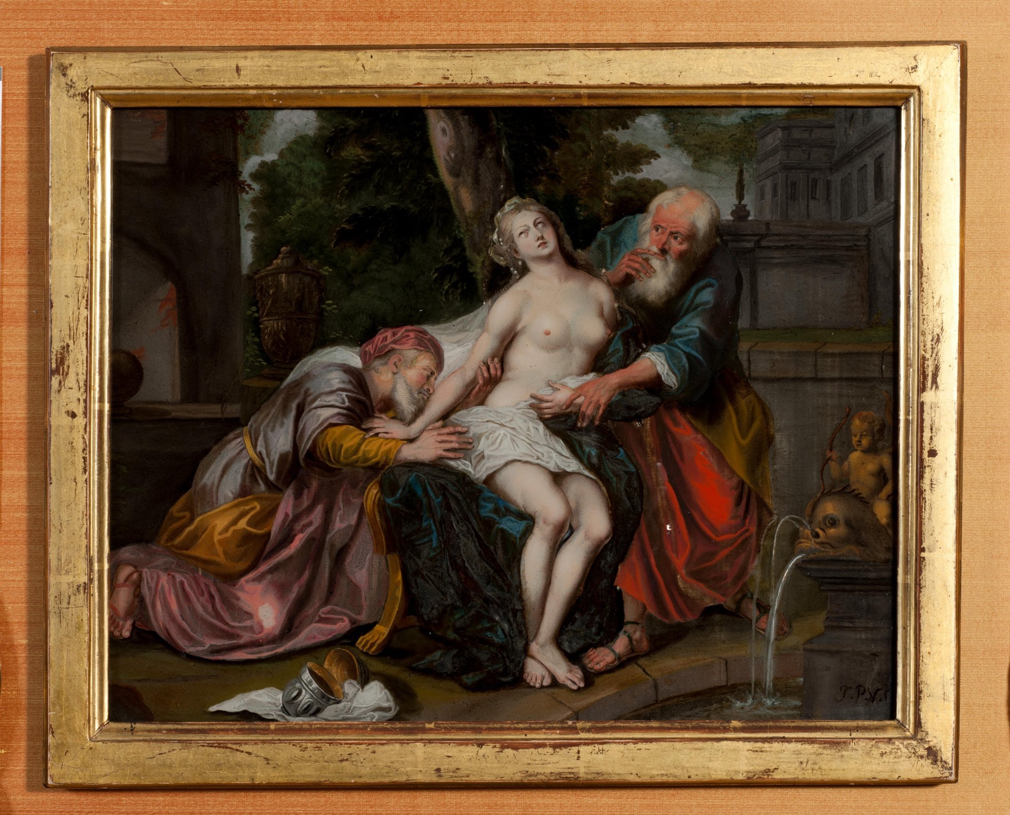Die Szene der versuchten Verführung Susannas durch die Ältesten-Richter spielt sich nach dem deuterokanonischen Kapitel Daniel 13 in einer ummauerten Gartenanlage mit reliefierter Urne ab. In der Bildmitte sitzt die Gattin Jojakims auf einem mit blauem Mantel bedeckten Sessel. Sie ist bis auf ein über ihren Schoss gelegtes weisses Tuch nackt. Ihr von langem Blondhaar gerahmtes Haupt ist mit Perlen geschmückt. Den Blick flehentlich zum Himmel erhoben erleidet sie den Angriff der beiden Alten, von denen der links kniende ihren Arm erfasst und küsst. Von hinten nähert sich rechts der zweite Richter, ergreift ihre linke Hand und führt Stillschweigen heischend den Finger an seine Lippen. Im Vordergrund liegt links auf weissem Tuch eine offene gebuckelte Silber-Pyxis mit vergoldeter Innenseite. Aus einem bronzenen Delphin, auf dem eine Amorfigur mit Pfeilbogen reitet, spritzt am rechten Bildrand Wasser in das runde Brunnenbecken, in dem Susanna eben ihr Bad nehmen wollte. Den Blick in die Tiefe hemmen links und rechts Teile einer grossen Palastarchitektur und hinter Susanna der grosse Baum, dessen Identifizierung den Alten zum Verhängnis werden sollte.