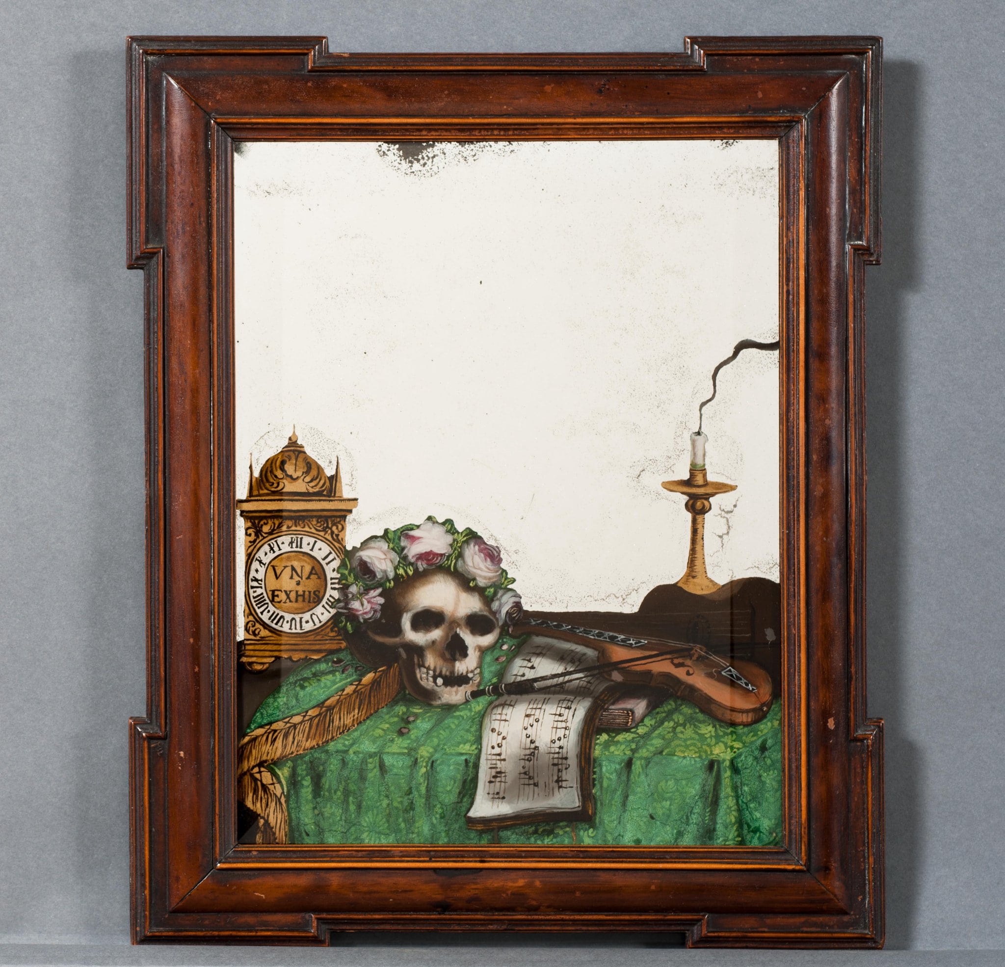 Vor dem Spiegelgrund erscheint in der unteren Bildhälfte ein memento mori als Allegorie der Vanitas. Auf einem grünen Tischtuch mit Goldborte ruht ein rosenbekränzter Totenschädel neben einem geschlossenen und einem aufgeschlagenen Notenbuch. Auf diesen liegt eine Geige mit ihrem Bogen. Im Hintergrund mahnen rechts eine eben ausgeblasene Kerze und links eine zeigerlose Tischuhr mit römischen Stundenziffern und mit der Aufschrift VNA / EX HIS an die Vergänglichkeit menschlichen Lebens und Tuns.