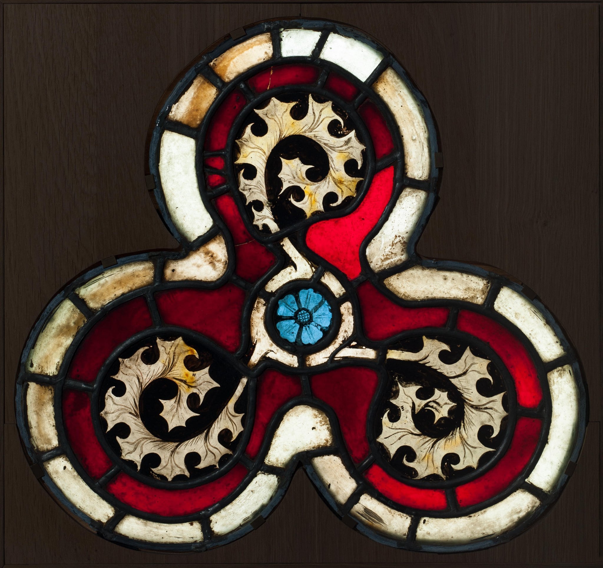 Vitrail au plomb en forme de jour trilobé, décoré de trois feuilles de houx ou de chênes enroulées et entourant une petite rosace bleue. Les feuilles blanches, émergeant de l’anneau blanc qui cerne la rosace centrale, se détachent clairement sur un fond rouge. Un filet d’encadrement blanc entoure le trilobe.