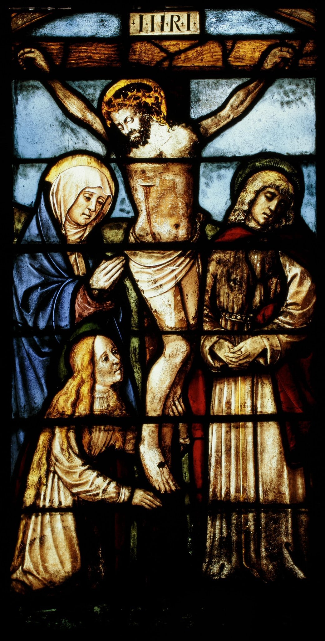 Vitrail au plomb composé de sept panneaux représentant la Crucifixion. La Vierge Marie, saint Jean et Marie-Madeleine se trouvent au pied de la croix. Les jambes du Christ sont tournées vers la droite, en direction de saint Jean. Sa tête, portant une double couronne d’épines entremêlées, est dirigée vers la gauche. Ses yeux sont clos. A gauche se tient Marie, debout, les mains jointes devant la poitrine, drapée d’un manteau bleu. Elle est voilée de blanc et auréolée. Marie-Madeleine est agenouillée au pied de la croix, vêtue d’une robe blanche, sa chevelure blonde descendant jusqu’au sol. Elle enserre le bas de la croix de ses bras. Saint Jean est représenté à droite, debout, auréolé de vert, portant une tunique blanche et un manteau rouge. Le visage aux yeux clos est incliné vers sa gauche. Ses mains sont croisées en prière. Au sommet de la croix se trouve l’inscription “INRI”.