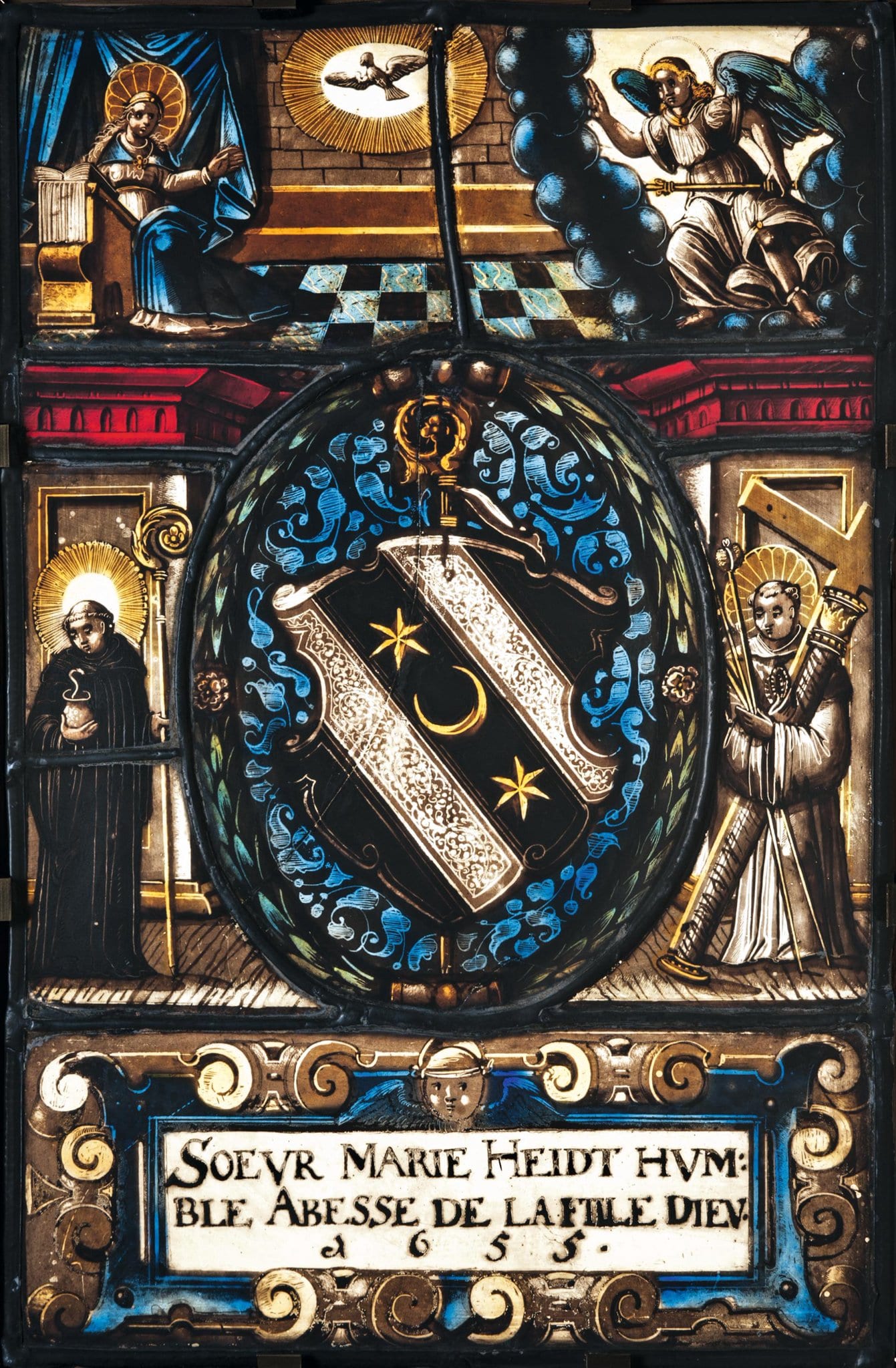 Stifterinschrift: SOEVR MARIE HEIDT HUM: / BLE ABESSE DE LA FILLE DIEV / 1655. (in der Rollwerkkartusche)