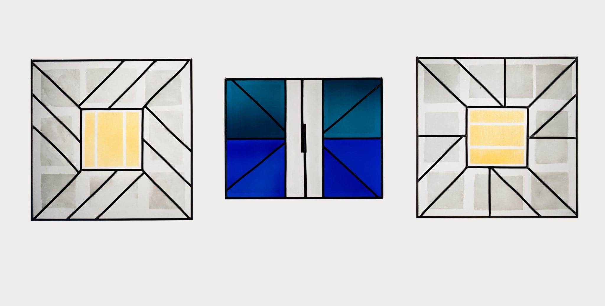 Triptyque formé de trois vitraux à composition géométrique : au centre un panneau rectangulaire avec des verres bleus et turquoise, entouré de part et d’autre d’un panneau carré de verres clairs.