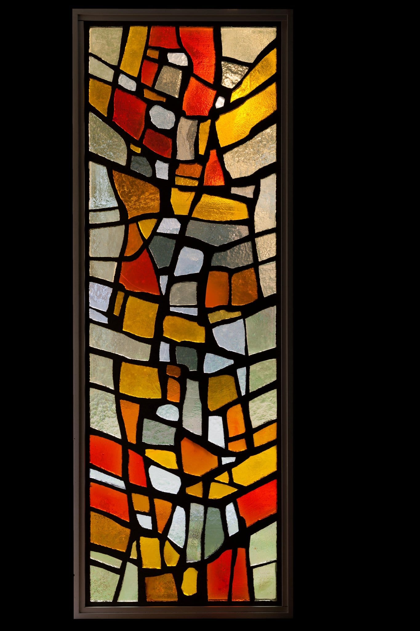 Par ses créations et son engagement dans le domaine artistique, l’artiste fribourgeois Yoki (Emile Aebischer) a acquis un renom dépassant largement les frontières cantonales et nationales. Ses vitraux et dalles de verre ornent d’innombrables bâtiments publics, aussi bien profanes que sacrés, majoritairement en Suisse, mais également à l’étranger. De nombreux particuliers ont également fait appel à l’artiste pour des interventions dans le domaine privé. Yoki adopte la technique de la dalle de verre pour la première fois en 1958 à Fribourg, pour décorer l’ensemble des fenêtres de la chapelle du Séminaire Regina Mundi (Université de Pérolles). Il propose alors une composition figurative (Baud, 2001, p. 59). Dès 1962, l’artiste privilégie l’abstraction, sans délaisser entièrement la figuration. Le Vitromusée Romont conserve par exemple dans ses collections une dalle de verre de 1981 représentant Saint Georges (VMR 240). Pour l’exécution de ses projets de vitraux et de dalles de verres, l’artiste a principalement collaboré avec l’atelier Michel Eltschinger à Villars-sur-Glâne, s’impliquant beaucoup dans le processus d’élaboration. Artiste polyvalent, connu notamment pour ses peintures, tapisseries, mosaïques et fresques, Yoki a “toujours été un excellent ambassadeur du vitrail” (Baud, 2001, p. 7). Il est cofondateur en 1981 du Musée suisse du vitrail à Romont, ville qui l’a vu grandir et où il a côtoyé Fernand Dumas et Alexandre Cingria, meneurs du groupe de Saint-Luc.