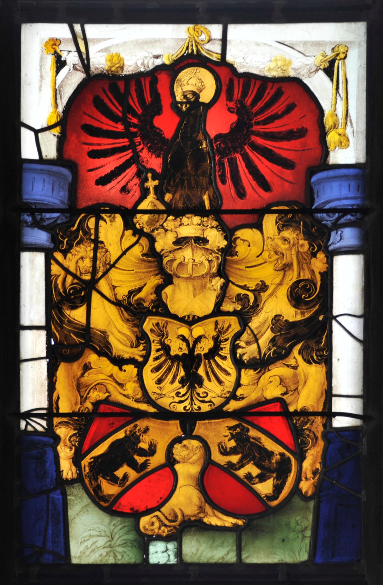 Die vor roten Grund gesetzte Wappenpyramide Bern-Reich begleiten zwei schildhaltende Löwen. Ein dritter Löwe kauert zwischen den beiden Bernschilden auf dem grünen Wiesenboden. Auf dem gekrönten Wappenhelm des Reichsschilds sitzt mit ausgebreiteten Schwingen der nimbierte und gekrönte Reichsadler mit dem Reichsapfel in seinen Krallen. Die architektonische Rahmung besteht aus weissen Rundpfeilern mit blauen Postamenten und Kapitellen sowie einem darüber gespannten weissen Rundbogen, den eine Blattgirlande schmückt.