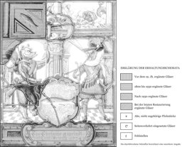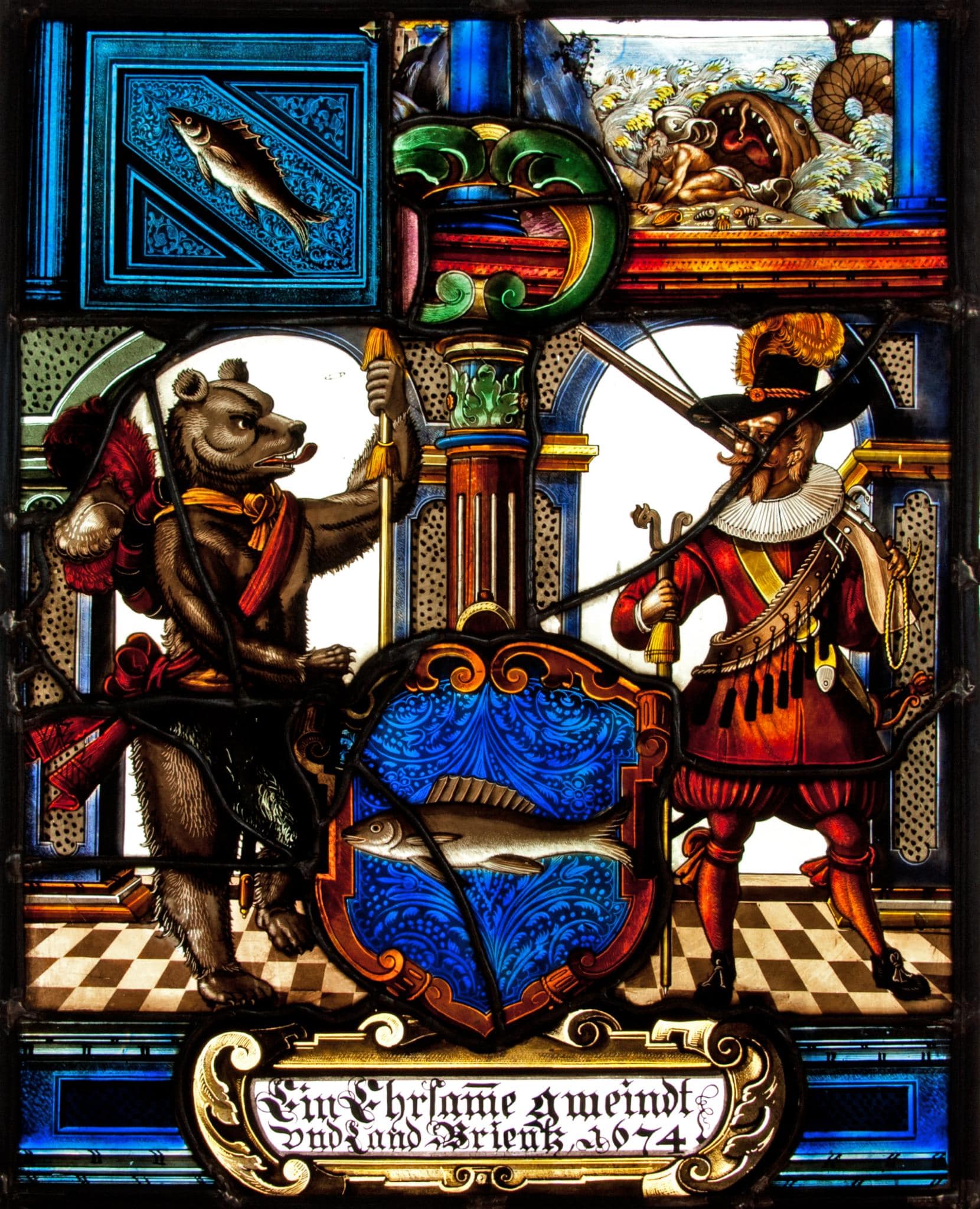 Das auf die gelbe Rollwerkkartusche mit der Stifterinschrift gesetzte Wappen der Gemeinde Brienz bewachen zwei auf braun-gelb gefliestem Boden stehende Begleiter. Links steht der Brienzer Bannerträger in Bärengestalt. Mit roter Schärpe und schwarz-rotem Federhut ausgestattet, hält dieser in seiner linken Vorderpranke die Brienzer Fahne mit dem Fisch im geschrägten blauen Feld. Gegenüber dem die Landesherrin Bern repräsentierenden Bären ist ein bärtiger Schütze postiert. Er erscheint in bräunlichrotem Koller mit Mühlsteinkragen, bräunlichroten Hosen und Strümpfen und mit einem schwarzen federgeschmückten Schlapphut. Seine Büchse geschultert und das Patronenbandelier um die Brust gebunden, stützt er sich mit seiner Rechten auf die Gewehrgabel. Hinter Wappen und Figuren erhebt sich vor farblosem Grund eine Doppelarkade aus marmorierten Pfeilern mit vorgelagerter kannelierter Mittelsäule und bräunlichrotem Gebälk. Darüber ist zwischen blauen Pfeilern der Prophet Jonas dargestellt, der vom Fisch an Land gespieen wird. Diese Szene nimmt das Fischmotiv des Brienzer Wappens und Banners auf.