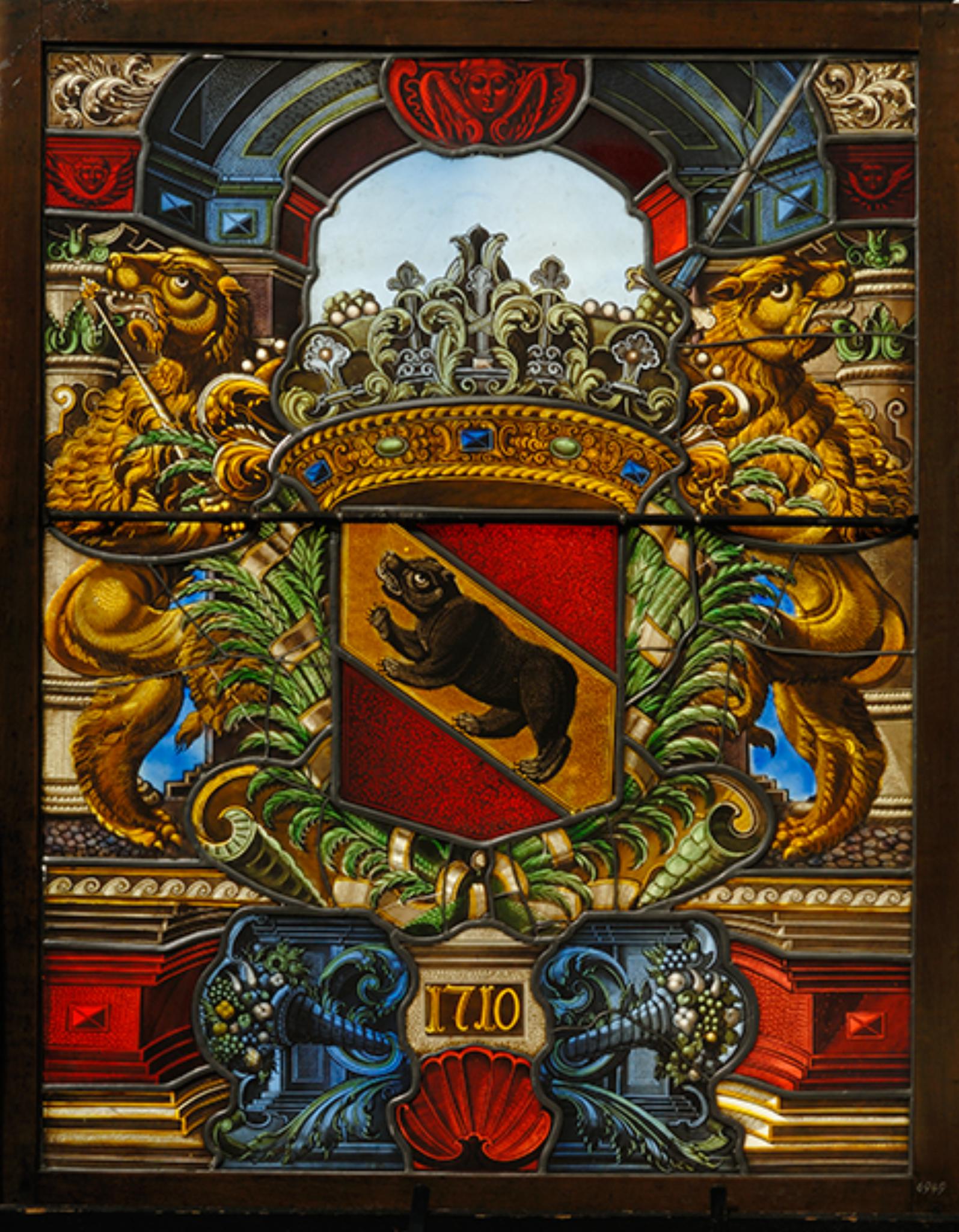 Der schmuckvoll umkränzte und bekrönte Berner Wappenschild steht auf einem reich dekorierten Podium, in dessen Zentrum das Stiftungsjahr festgehalten ist. Begleitet wird er von zwei rückwärts blickenden Löwen, die Zepter und Schwert in ihren Vorderpranken halten. Hinter ihnen erhebt sich vor hellblauem Grund die dreiachsige Rahmenarkade, deren Bogenzone mit drei geflügelten roten Engelköpfen verziert ist.