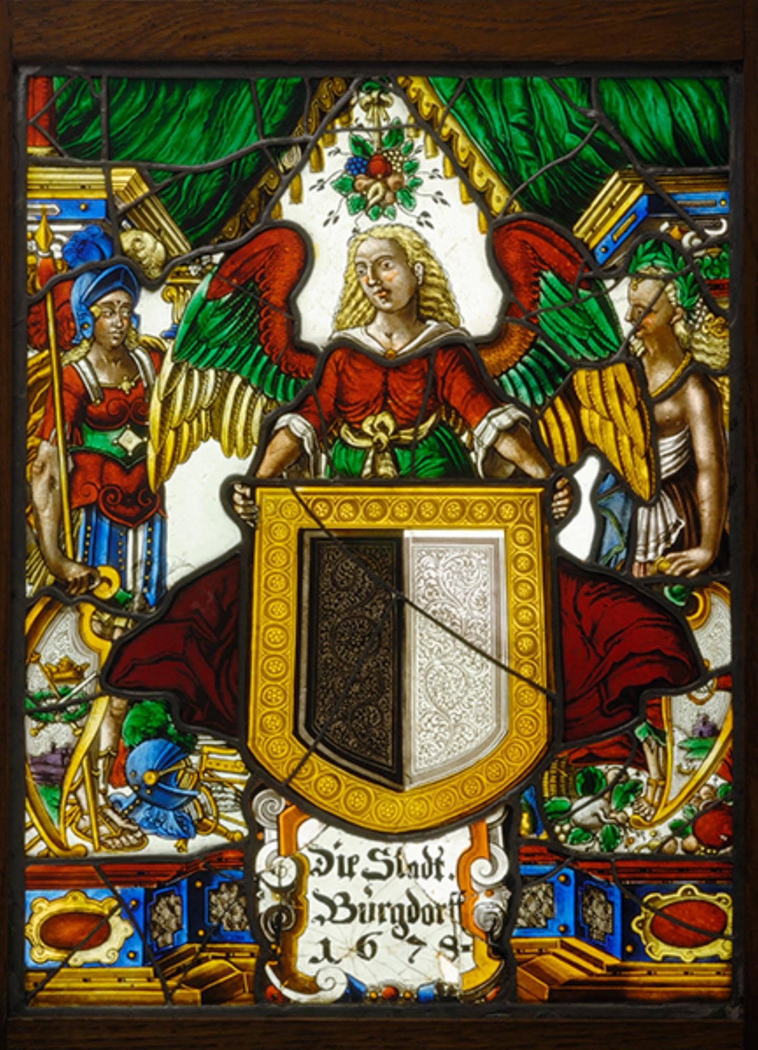Vor farblosem Grund hält ein Engel in langem rotem Gewand das auf die Schriftkartusche gesetzte Stadtwappen von Burgdorf. Diesen begleiten zwei allegorische Frauengestalten, die auf dem Podium vor den Rahmenpfeilern stehen. Diejenige links in blauem Rock, rotem Brustpanzer und mit blauem Helm kann anhand ihrer Attribute Lanze und Schild als Victoria identifiziert werden. Ihr Gegenüber, eine barbusige lorbeergekränzte Frau in weissem Gewand, stellt aufgrund des Schildes mit der ausgestreckten Hand und anhand der Früchte zu ihren Füssen die Allegorie der Pax dar.