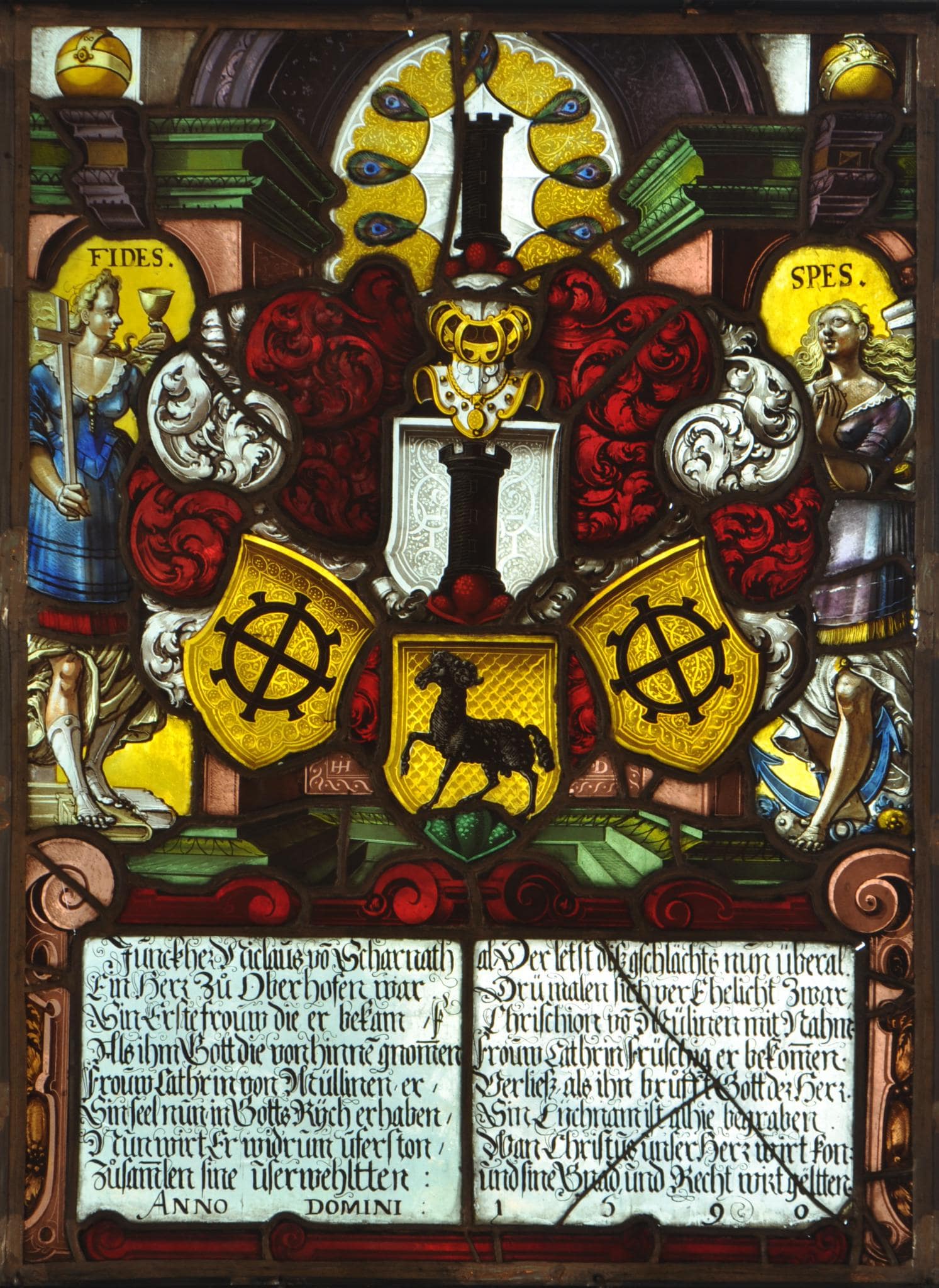 Junckher Niclaus vo Scharnath al Der letst diβ gschlächts nun überal. / Ein Herr Zů Oberhofen war, Drü malen sich verEhelicht Zwar, / Sin Erste frouw die er bekam F Chrischion vo Mülinen mit Nahm / Als ihm Gott die von hinne gnomen Frouw Cathrin Früschig er bekomen / Frouw Cathrin von Müllinen er Verlieβ als ihn brůfft Gott der Herr / Sin seel nun in Gotts Rÿch erhaben, Sin Lÿchnam ist alhie begraben / Nun wirt Er widrum uferston Wan Christus unser Herr wirt kon / Zůsamlen sine userwehltten : und sine Gnad und Recht wirt geltten. / ANNO DOMINI 1590.