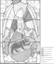 Je ein Glas im roten Mantel und linken Flügel des Engels sowie je ein kleines Stück im Wappen, in der rechten Säule und im Blattbogen neu ergänzt; ein kleines altes Flickstück im linken Engelsflügel; einige kleine Sprünge und Sprungbleie; die Verbleiung erneuert.