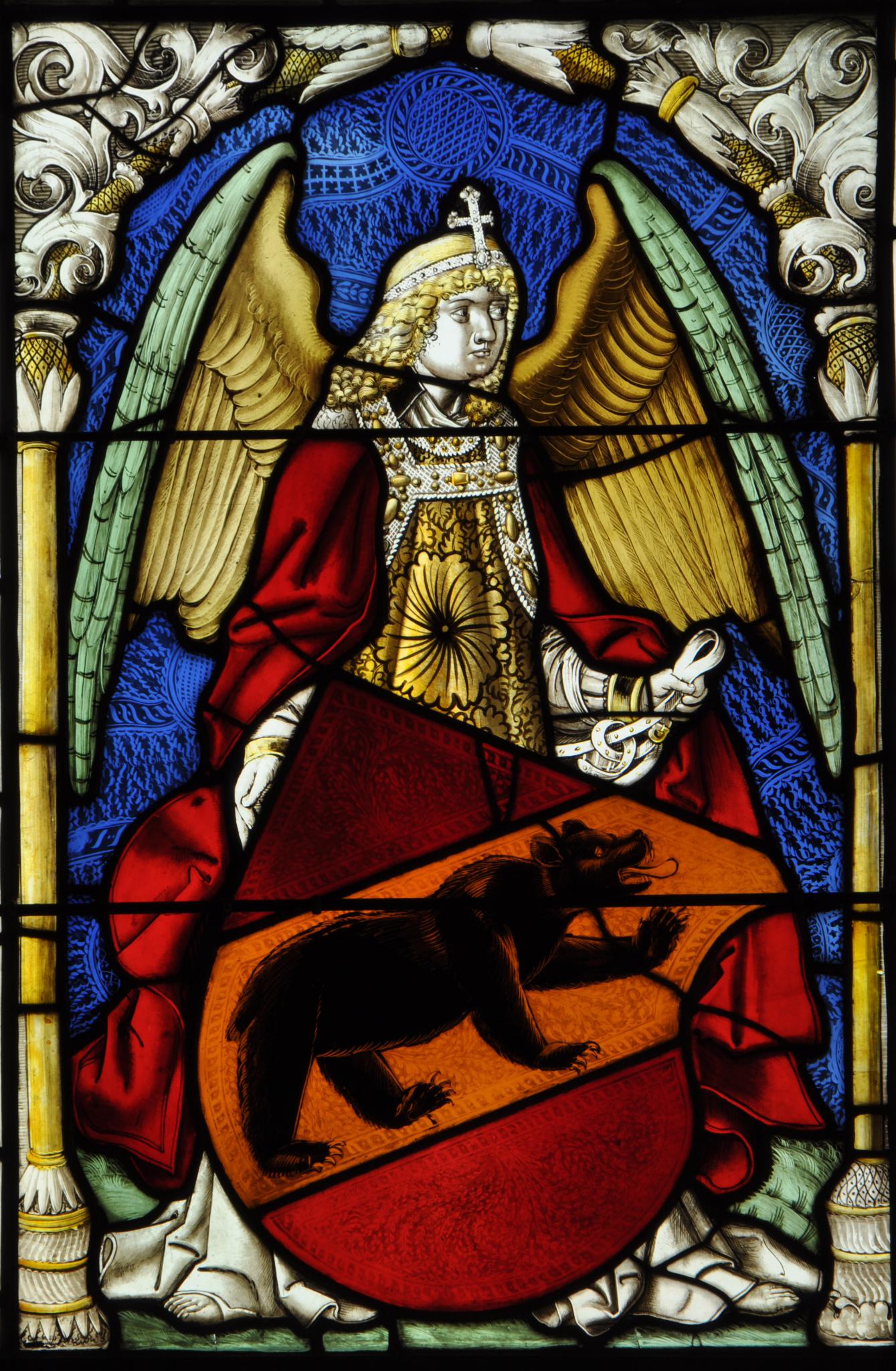 Ein Engel in prachtvoller gelber Brokatdalmatika und einem weiten roten Mantel hält an einer Fessel den Bernschild. Er steht vor blauem Damastgrund auf grünem Wiesengrund. Als Rahmung dienen zwei schlanke gelbe Säulen, bekrönt von einem Spitzbogen aus gerolltem Blattwerk.