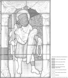 Ein Glas oben im roten Damast alt ergänzt; ein Glas im linken Pfeiler sowie der Kopf des Heiligen und ein Teil von dessen linken Bein und dessen Mantel neu ergänzt; stellenweise Verluste in der Schwarzlotbemalung; ein Sprung und Sprungbleie; die Verbleiung erneuert.