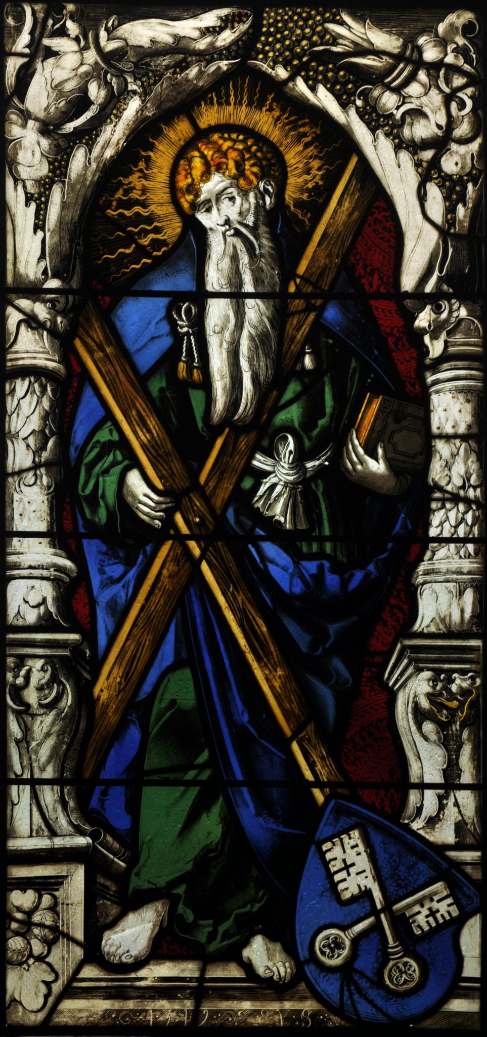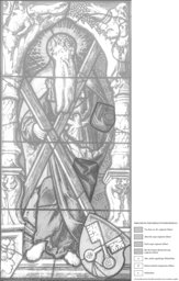 Die linke Hand mit dem Buch und ein blaues Mantelstück des Heiligen sowie das Eckstück unten rechts neu ergänzt; stellenweise geringe Schwarzlotverluste; kleine Sprünge und Sprungbleie; die Verbleiung erneuert.