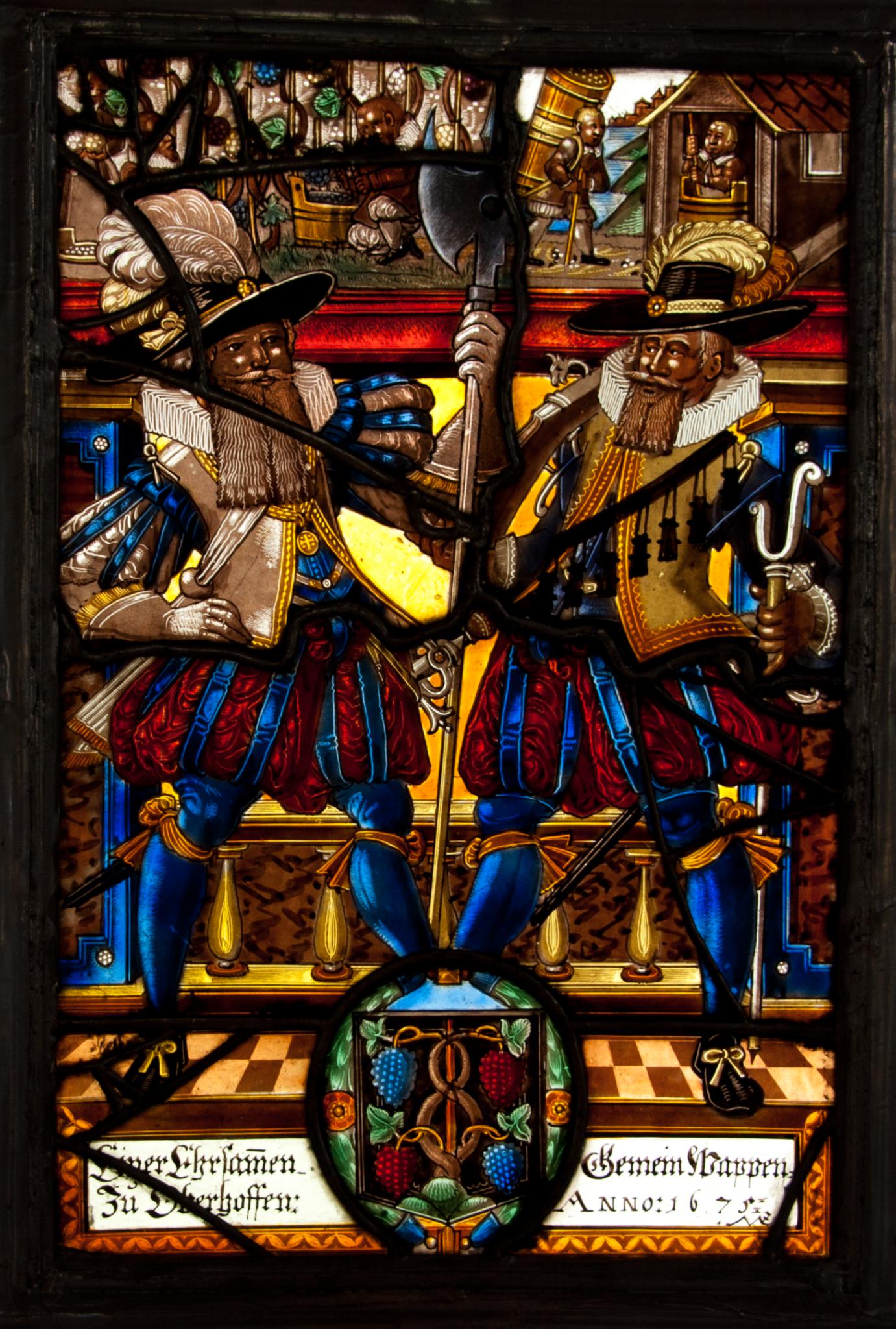 Vor einer Balustrade sind ein schwertbewaffneter Halbartier und ein Büchsenschütze dargestellt. Die zwei auf Fliesenboden stehenden bärtigen Krieger mit einem Schlapphut auf dem Kopf sind in ein Lederwams, rote Pluderhosen mit blauen Streifen und blaue Strümpfe gekleidet. Der die Gewehrgabel haltende Schütze links hat das Patronenbandelier um die Brust gebunden und seine Büchse geschultert. Zu Füssen der beiden Männer erscheint in einem ovalen Blattkranz der die Tafel mit der Stifterinschrift zentral unterteilende Wappenschild Oberhofens. Seitlich der Männer ragen vor gelbem Grund zwei blau geränderte, marmorierte Pfeiler in die Höhe. Sie tragen ein rotes Gebälk, über dem im Oberbild Oberhofener Bauern bei der Weinlese am Thunersee zu sehen sind.
