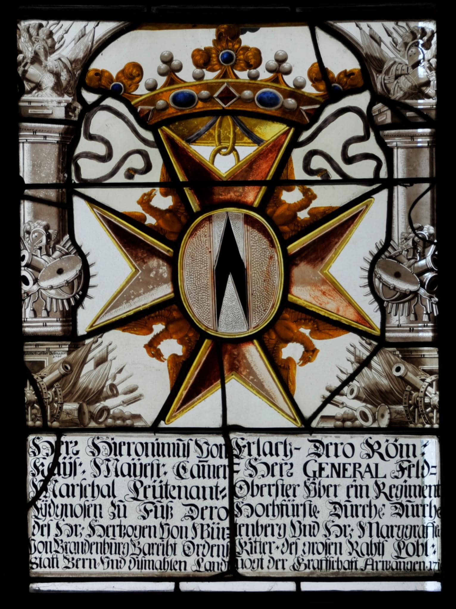 Vor farblosem Grund erscheint das von einer Krone überhöhte ovale Wappen des Hieronymus von Erlach. Es ist in ein sternförmiges Emblem gesetzt, das vermutlich dasjenige des Roten Adlerordens ist. Umfasst wird es von einem Flachbogen auf Pfeilern, die reich mit Waffentrophäen und Fahnen dekoriert sind. Am Scheibenfuss steht die lange Stifterinschrift.