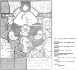 Die linke Hälfte der Inschriftentafel, Teile des linken Palmwedels und das Eckstück oben links neu ergänzt (das Foto des SNM Zürich zeigt an Stelle der Ergänzungen mehrheitlich Glaslücken sowie weniger Sprungbleie als heute); mehrere geklebte Sprünge und Sprungbleie; die Verbleiung erneuert.