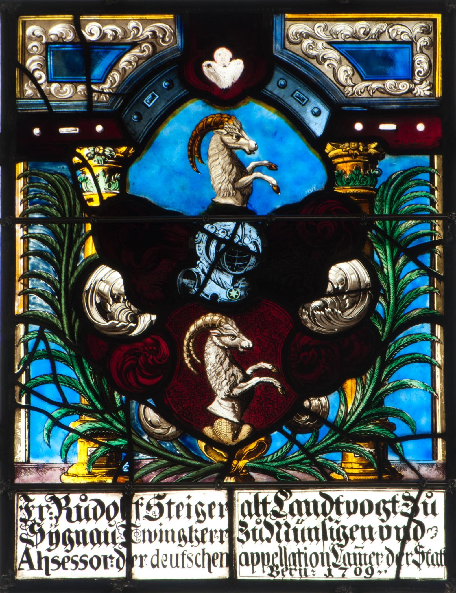 Vor wolkig-blauem Grund steht das von zwei grünen Palmzweigen umkränzte Vollwappen Rudolf Steigers. Dahinter erhebt sich eine dreiachsige Architektur aus gelben Innensäulen und einem eingezogenen Bogen, dessen rote Scheitelkartusche eine Engelsbüste schmückt. Am Scheibenfuss nimmt die Stifterinschrift die ganze Scheibenbreite ein.