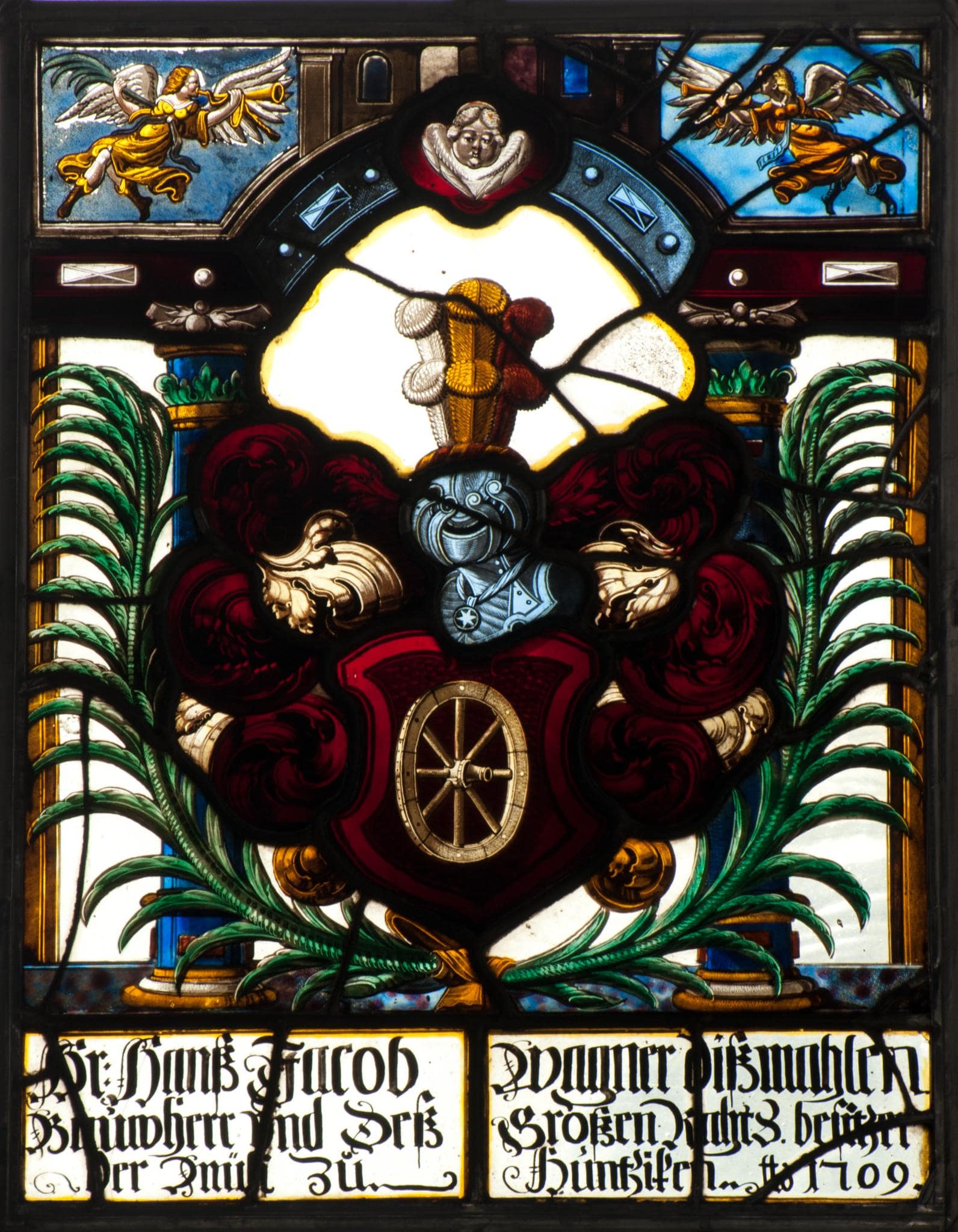 Vor farblosem Grund steht das von zwei grünen Palmzweigen umkränzte Vollwappen Hans Jakob Wagners. Dahinter erhebt sich eine dreiachsige Architektur aus blauen Innensäulen und einem eingezogenen Bogen, dessen rote Scheitelkartusche ein Engelskopf schmückt. In den beiden oberen blauen Zwickelfeldern erscheint je ein hornblasender Engel. Der Scheibenfuss nimmt die Stifterinschrift auf.