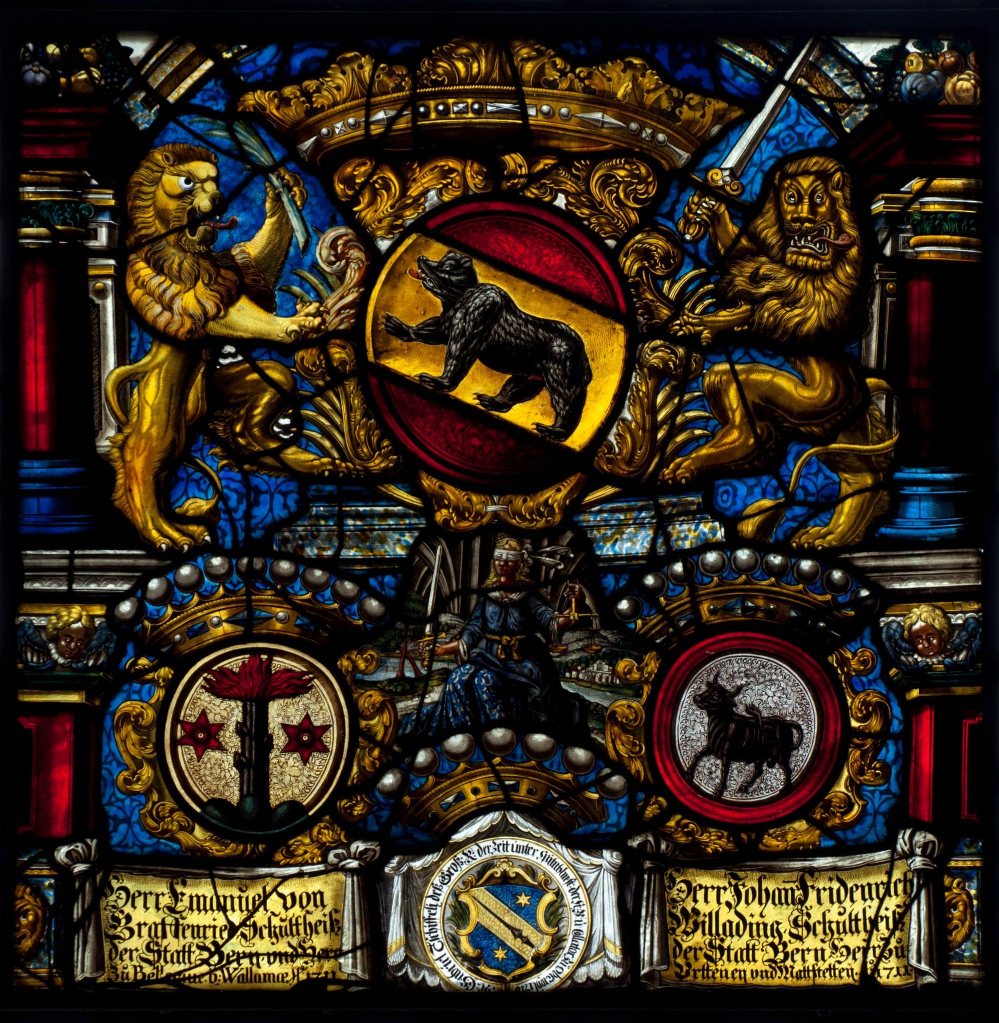 Wie das Glasgemälde von Dübelbeiss musste dasjenige des Standes und Spitals Bern offenbar durch Andreas Fueter repariert werden. Der darauf dargestellte Löwe links lässt sich so in seinen alt ergänzten Teilen mit demjenigen auf dessen Standesscheibe in der Kirche Frutigen vergleichen.