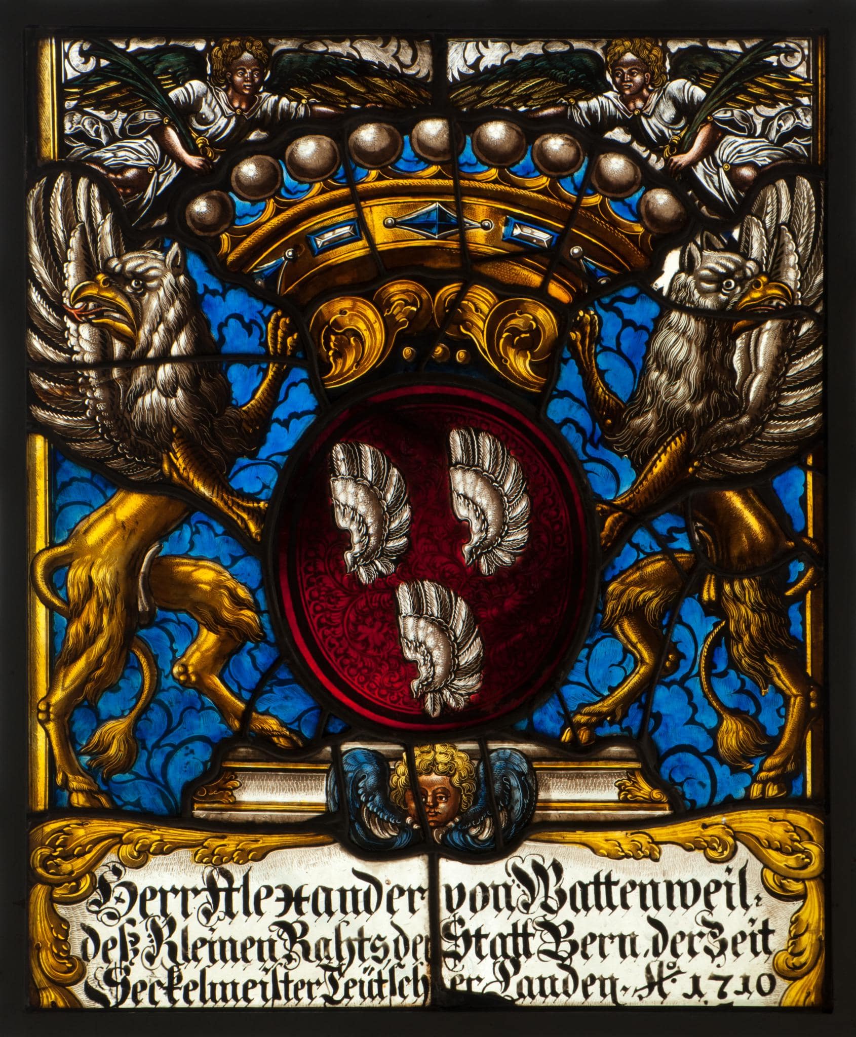 Berns Obrigkeit verehrte der fertig renovierten Kirche gleich mehrere Wappenscheiben. Unter den dort heute vorhandenen alten Glasgemälden zählen dazu die drei 1710 datierten des Deutschseckelmeisters Alexander von Wattenwyl und der Venner Johann Jakob Dübelbeiss und Johann Anton Kirchberger sowie die Bernscheibe von 1711. Im Laufe der zweiten Hälfte des 17. Jahrhunderts war die Berner Regierung dazu übergegangen, ihre erneuerten Landkirchen jeweils mit einer ganzen Glasgemäldeserie zu beschenken. Dazu gehörten normalerweise sechs Scheiben, nämlich diejenigen mit den Wappen Berns, des Deutschseckelmeisters und der vier Venner (Thormann/von Mülinen 1896, S. 47f.). Dieser Schenkungsmodus kam vermutlich auch im Falle der Kirche Oberwils zur Anwendung. Man darf deshalb davon ausgehen, dass Bern 1710 noch zwei weitere, heute verschollene Vennerscheiben dorthin vergabte.