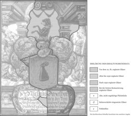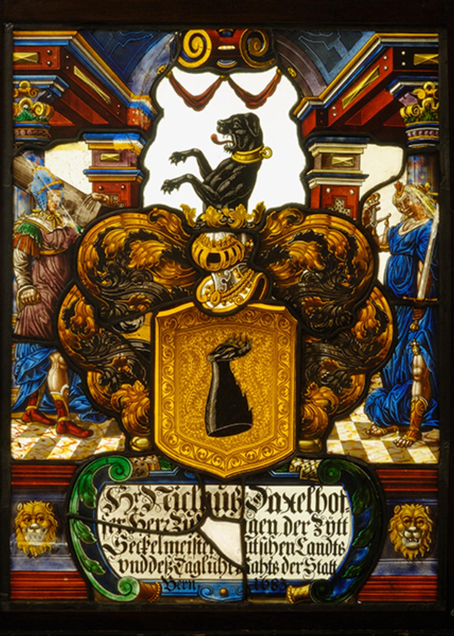 Im Zentrum erhebt sich auf der blau-grünen Rollwerktafel mit der Stifterinschrift das ergänzte Vollwappen Niklaus Dachselhofers. Es wird von zwei weiblichen Tugendgestalten begleitet, der Stärke (links) und der Gerechtigkeit (rechts). Die behelmte, in ein violettes Obergewand und einen blauen Unterrock gehüllte Fortitudo trägt auf ihren Schultern einen Säulenstumpf. Justitia, in blauer Kleidung, hält in ihren Händen Schwert und Waage. Die beiden Schildbegleiterinnen stehen auf gefliestem Boden vor den schmalen Seitenöffnungen der dreiachsigen, nach hinten fluchtenden Rahmenarchitektur. Die ans Podium gesetzte Schriftkartusche wird seitlich von Löwenmasken flankiert.
